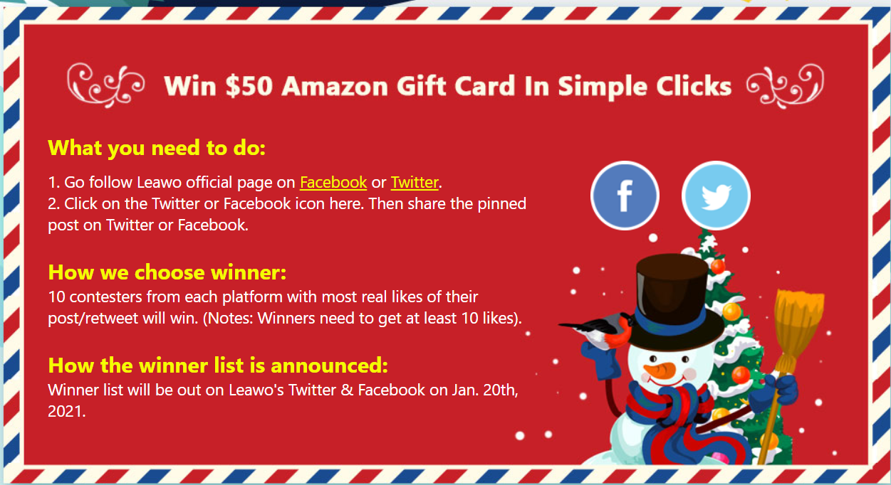 - Win a $50 Amazon gift card after following Leawo official page and sharing the post.