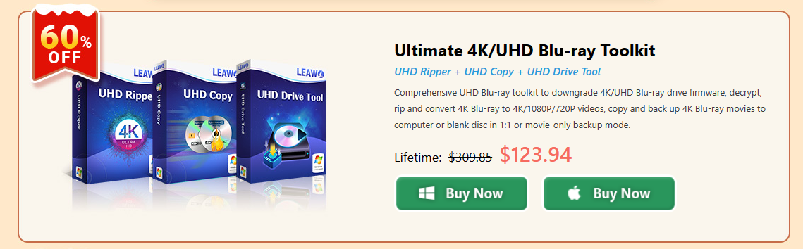 As one of the most comprehensive UHD solutions, Leawo Ultimate UHD Toolkit integrates 3 programs into 1 package, including UHD Ripper, UHD Copy, and UHD Drive Tool. During the event, this bundle is only $123.94, a savings of $185.91. In other words, a lifetime license for each module is only $41.31. The following are detailed introductions of 3 modules in this package.