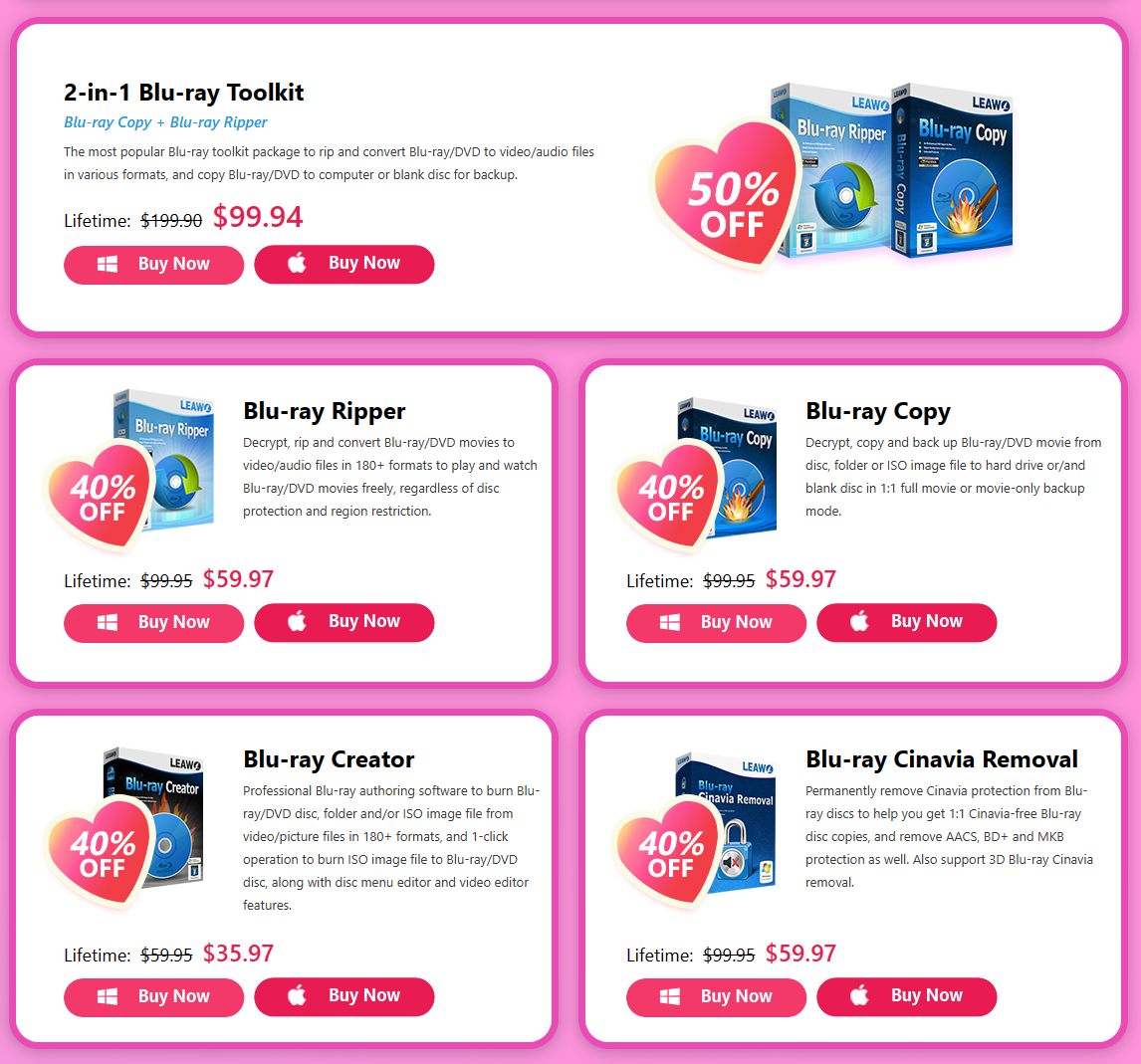 Blu-ray series win warm praise from customers, which is also the reason why Leawo is well-received in this field. Currently, Leawo’s Blu-ray series includes Blu-ray Ripper, Blu-ray Copy, Blu-ray Creator, and Blu-ray Cinavia Removal, and Leawo packs them into the Ultimate Blu-ray Toolkit. For a limited time, people can order this bundle at the price of $143.92 instead of original price $369.89 with a 60% discount. For more details on these products, see below: