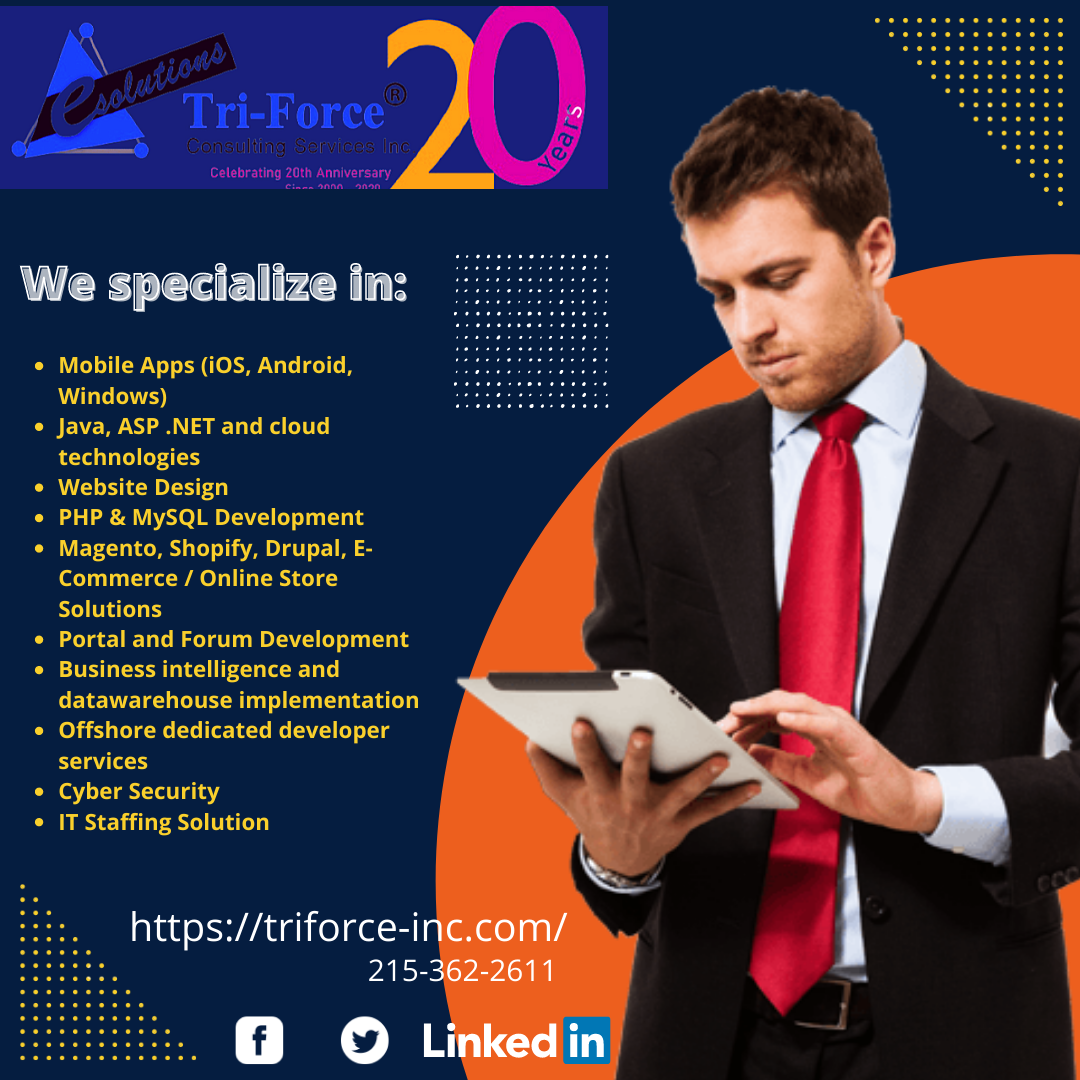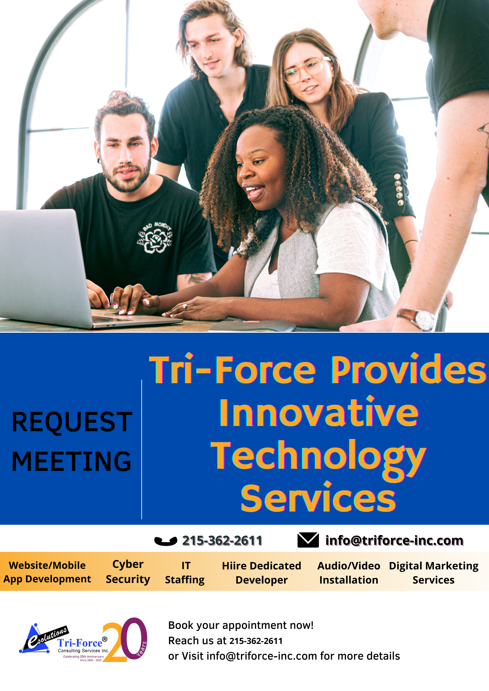 Tri-Force specializes in providing innovative and cost-effective software development (web and mobile apps), systems integration, data analytics, systems automation, cybersecurity, IT Staffing (Contract, Contract-to-Hire, Full-time placement), and cloud technology solutions, servicing government agencies and commercial industry sectors. Tri-Force helps clients with challenges such as improving productivity, improve efficiencies with automation, or reducing costs. Our clients benefit from our three values that differ from our competitors - Integrity, diligence, and Excellence in technologies.