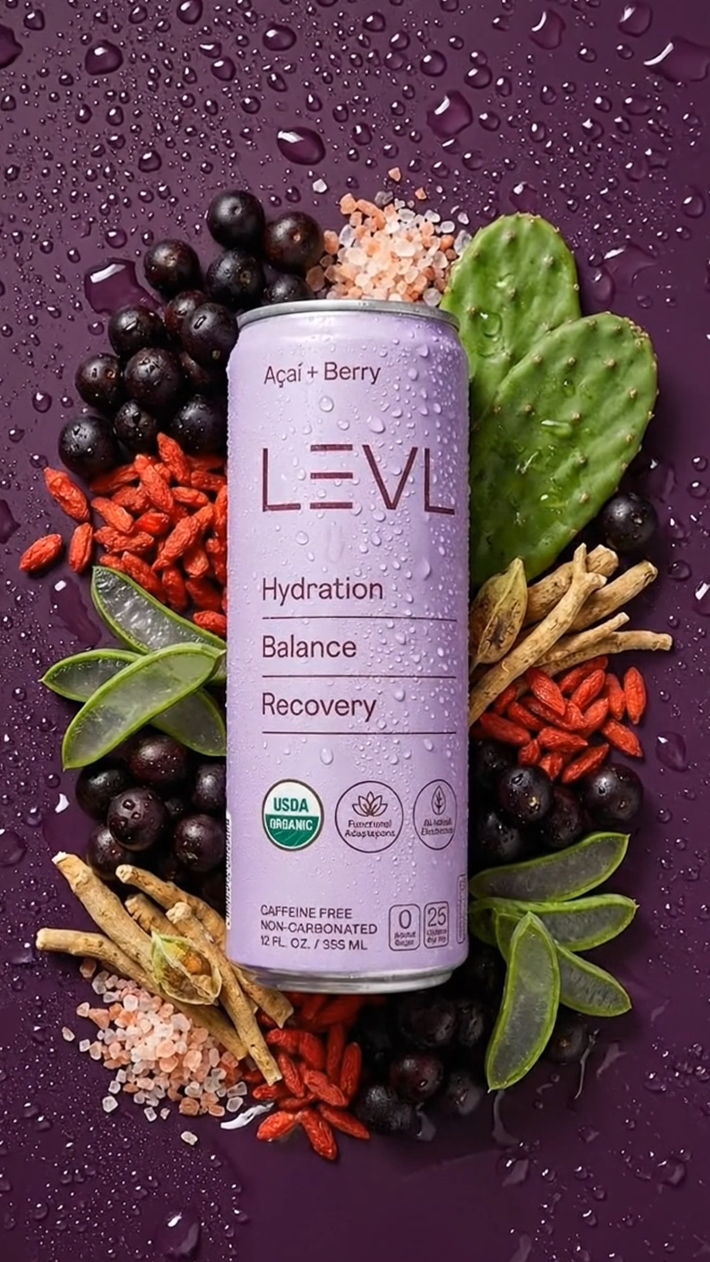 LEVL is positioned as an everyday wellness beverage that delivers clean hydration while also supporting recovery and mind + body balance. Unlike other hydration drinks that rely on processed electrolyte sources such as sodium chloride, LEVL uses all-natural electrolytes, including Aloe Vera, Nopal cactus, and Pink Himalayan Salt. It also includes functional adaptogens Ashwagandha and Goji Berry to support recovery and mind + body balance.