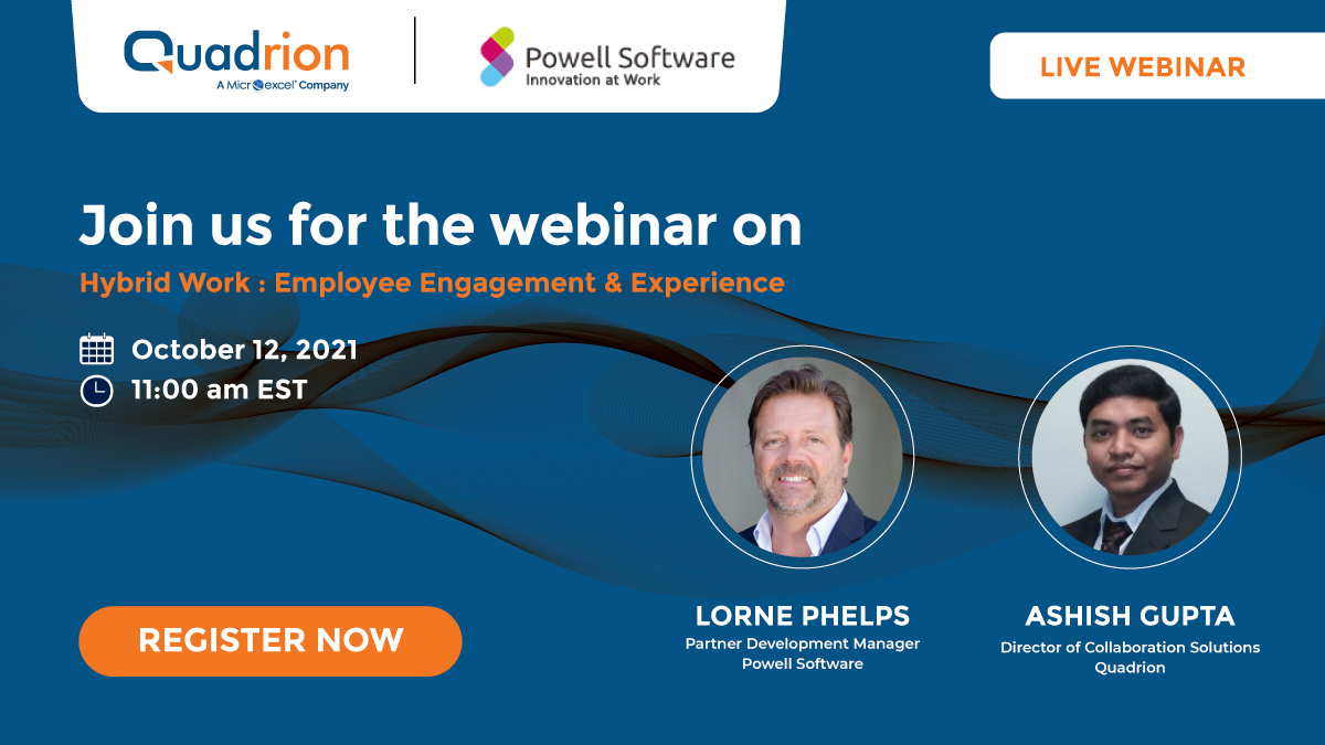 Join Quadrion and Powell Software on October 12, 2021, at 11:00 AM EST for a webinar as we discuss the different aspects to consider in order to define a modern Digital Workplace that truly drives the Hybrid Work transformation while placing the employee at the center of the experience.