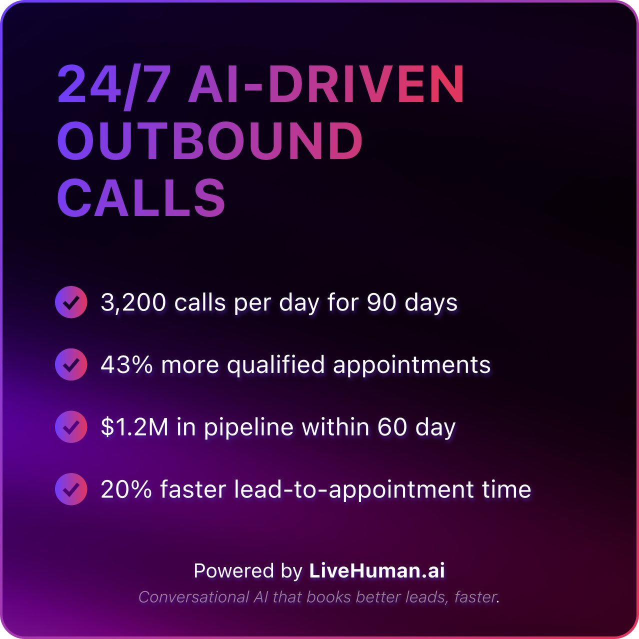 Live Human’s proprietary voice agents are designed to speak, pause, and respond like a live SDR. Built from scratch over four years, the system is fully proprietary, no "off the shelf" components or rented voice models. -