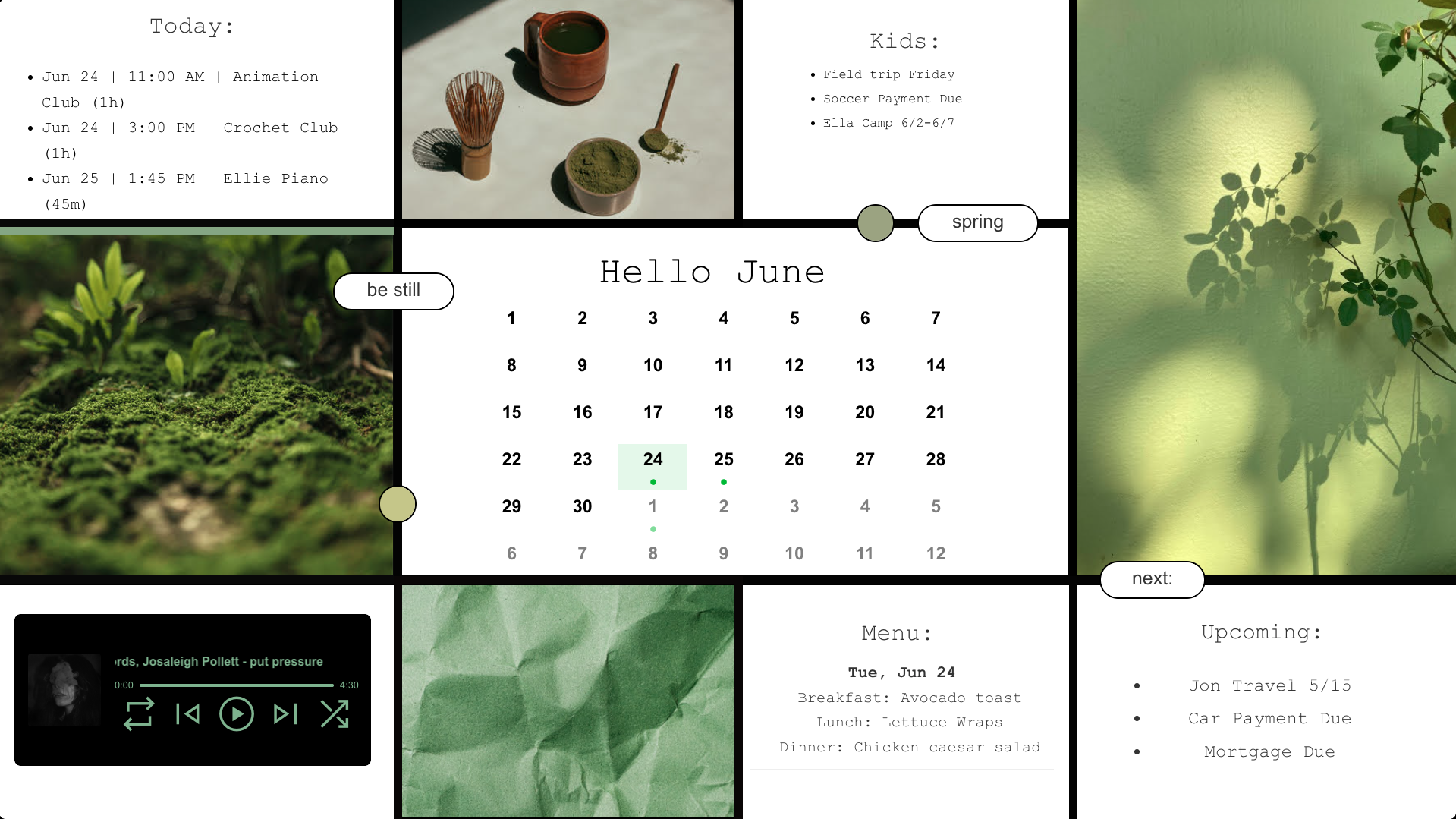 - Meal Planning & Digital Piggy Bank: Plan weekly dinners and track allowance or savings goals right alongside your schedule.