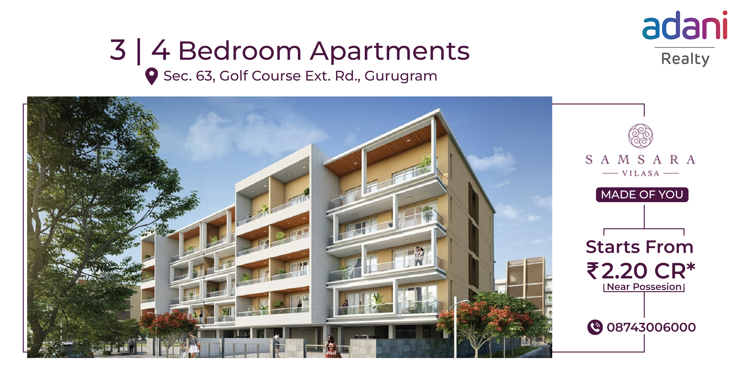 Adani Samsara Vilasa vilasasamsara@gmail.com 8743006000 Sector 63, Golf COurse Extn. Road, Gurgaon http://adaniprojects.in/