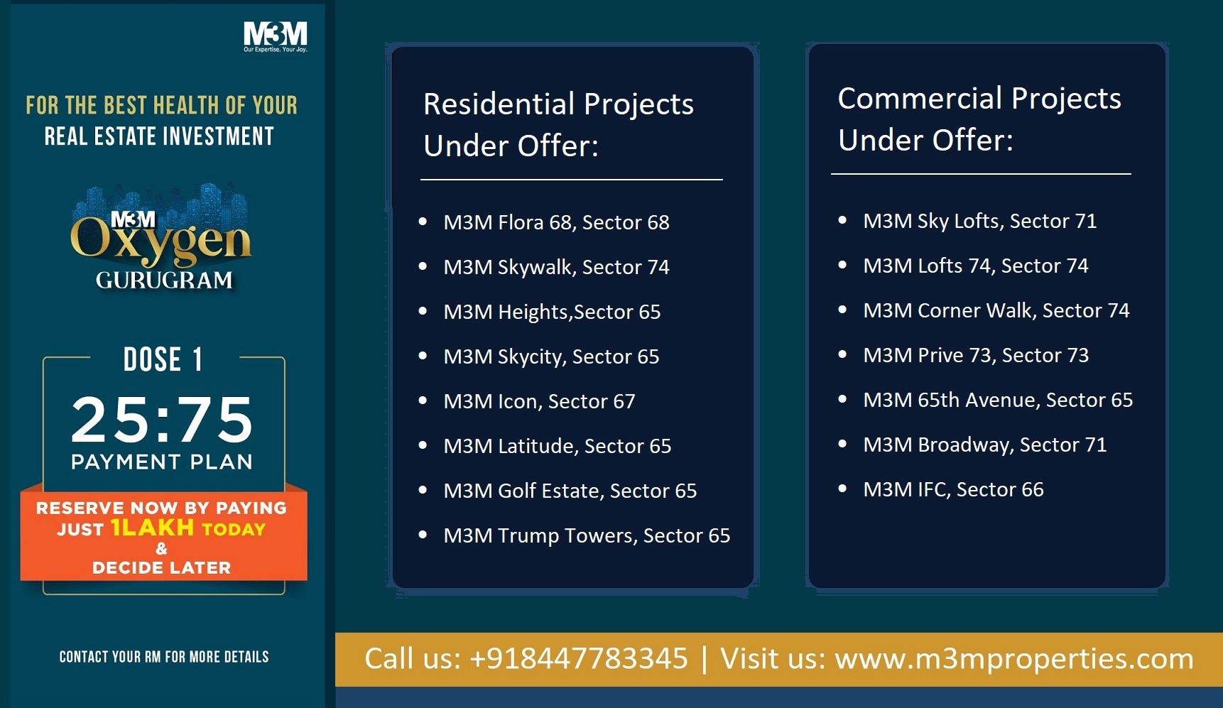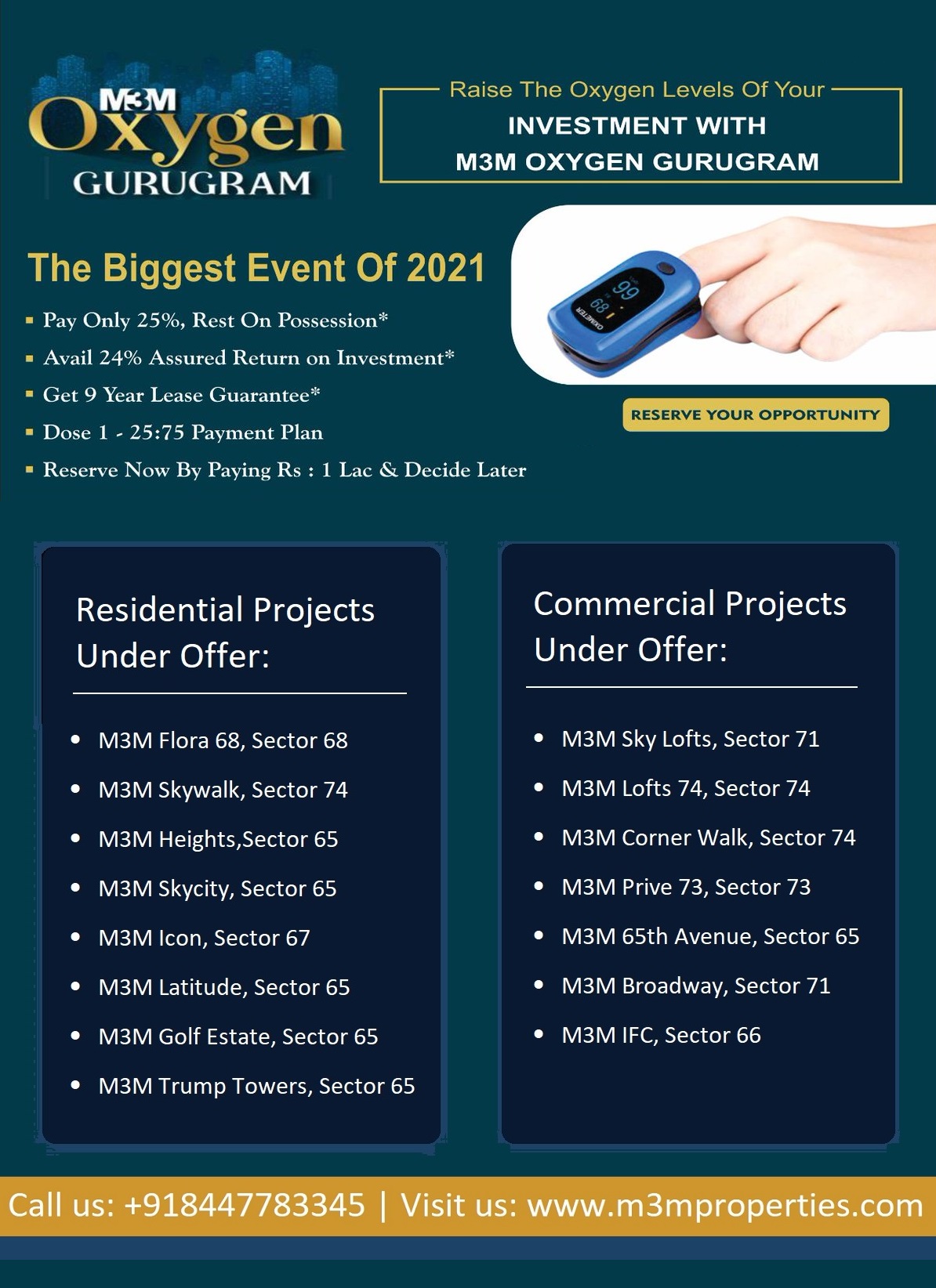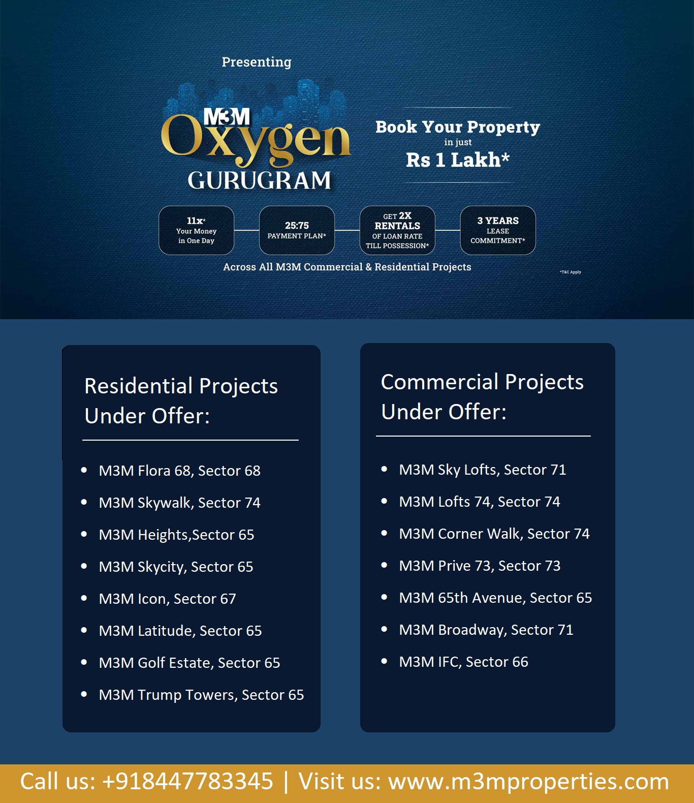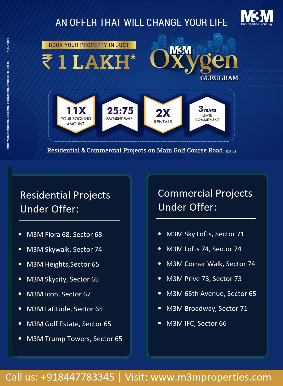 M3M property by paying 1 lac only are some of the best offerings of the M3M Oxygen Gurugram event. You can choose any desirable property from the M3M Residential Projects in Gurgaon and M3M Commercial Projects in Gurgaon to avail all these unbelievable benefits of the M3M Oxygen Gurugram, The Biggest Event of 2021.