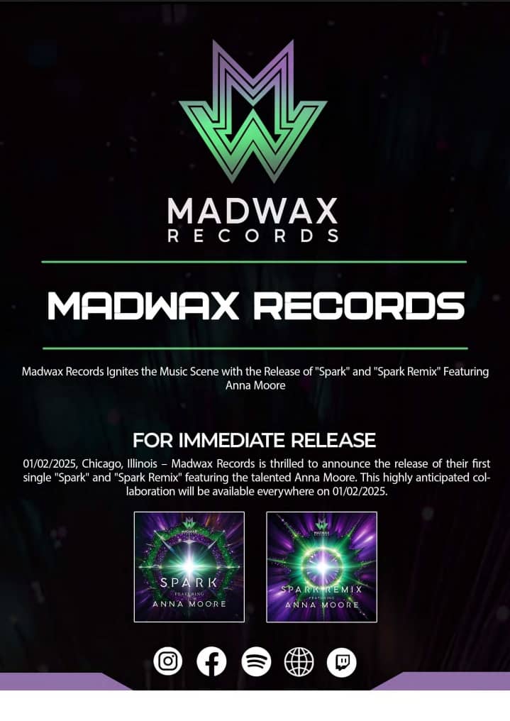 Madwax Records is thrilled to announce the release of their first single, "Spark" and "Spark Remix", featuring the talented Anna Moore. This highly anticipated collaboration will be available everywhere on 01/02/2025.
