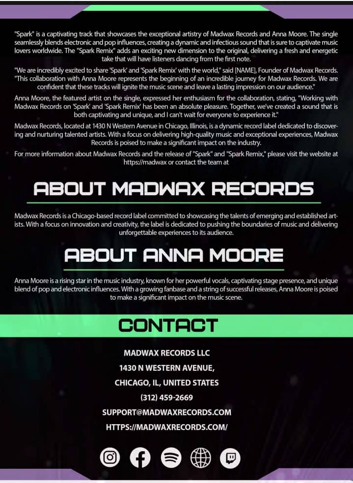 For more information about Madwax Records and the release of "Spark" and "Spark Remix", please visit the website at https://madwax or contact the team at: