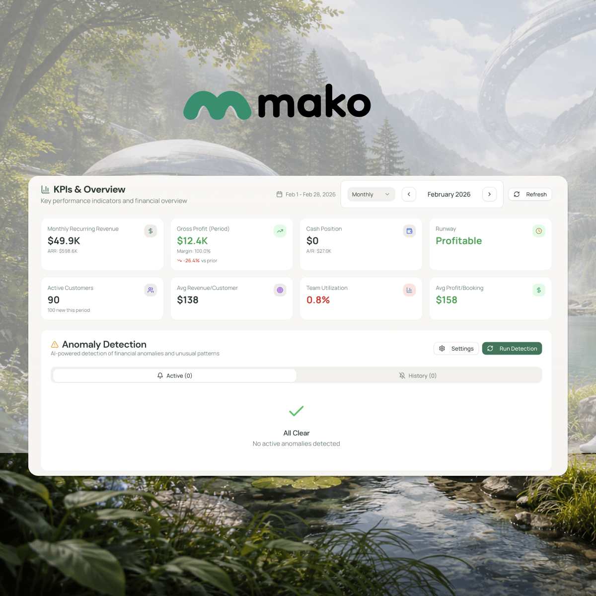 Mako CRM differs from existing gym software in how it treats financial data. The platform opens to a real-time dashboard displaying profit-and-loss statements, cash flow, revenue by membership tier, and per-class profitability. Gym owners can see which services generate margin, which membership categories are underperforming, and which members are at risk of cancellation.