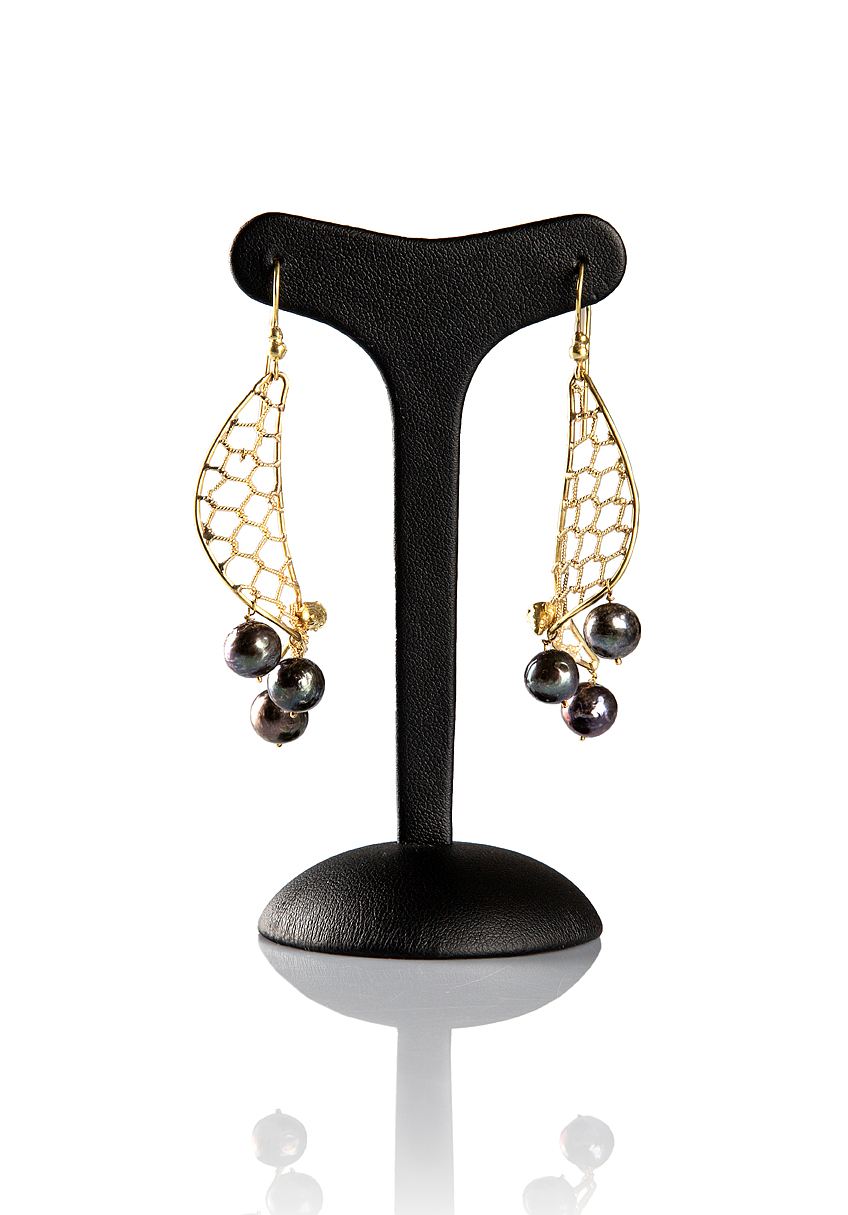 These photos feature Marco Danese’s laboratory, Mr. Marco Danese himself while working on filigree, a beautiful necklace and a stunning pair of earrings, and the model wearing a necklace and a ring by Danese’s filigree creations.