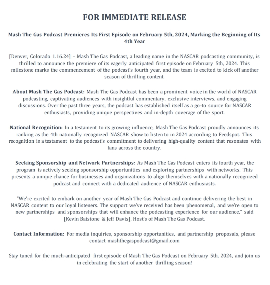 Seeking Sponsorship and Network Partnerships: As Mash The Gas Podcast enters its fourth year, the program is actively seeking sponsorship opportunities and exploring partnerships with networks. This presents a unique chance for businesses and organizations to align themselves with a nationally recognized podcast and connect with a dedicated audience of NASCAR enthusiasts. "We're excited to embark on another year of Mash The Gas Podcast and continue delivering the best in NASCAR content to our loyal listeners. The support we've received has been phenomenal, and we're open to new partnerships and sponsorships that will enhance the podcasting experience for our audience," said [Kevin Batstone & Jeff Davis], Host’s of Mash The Gas Podcast.