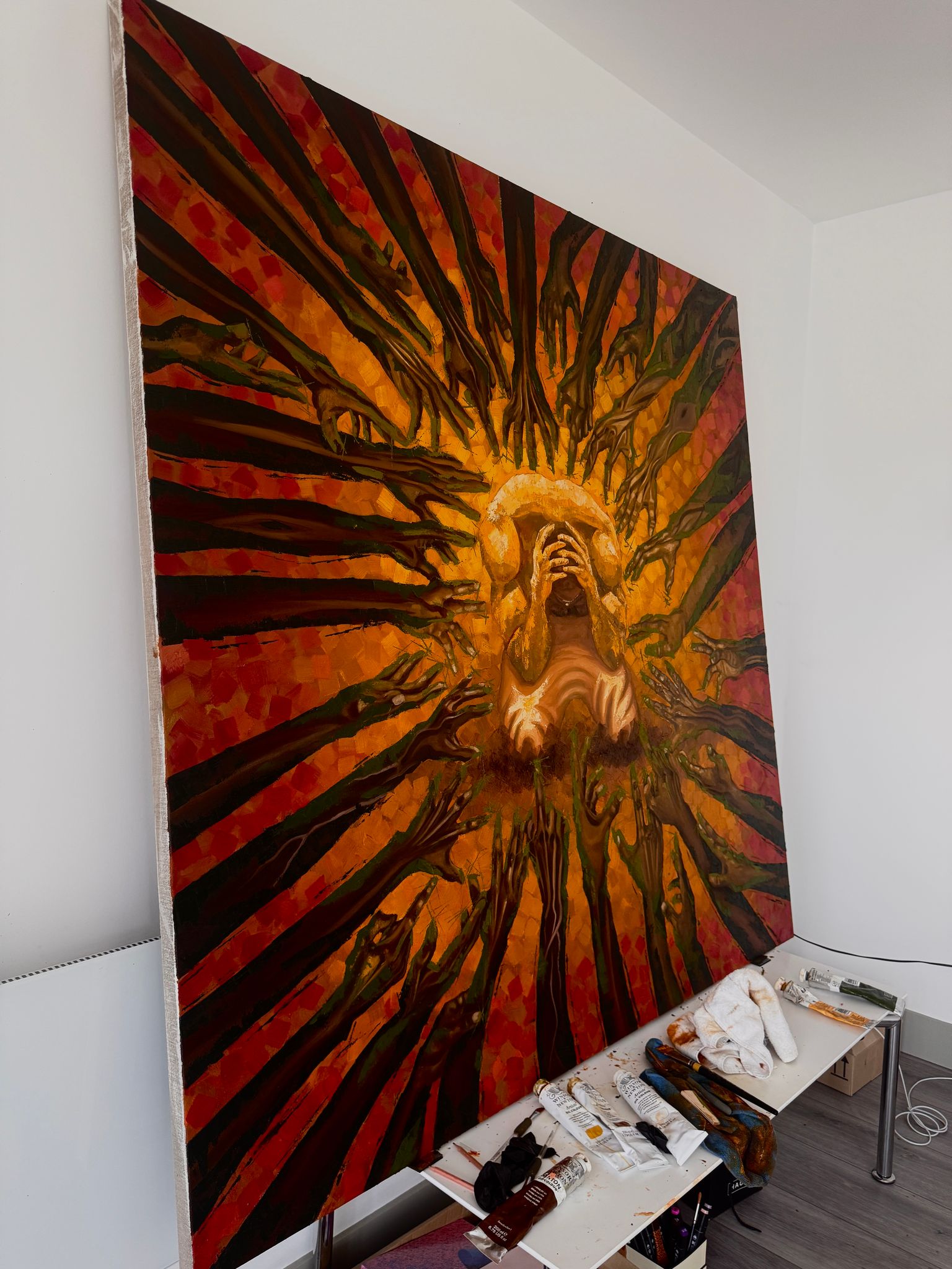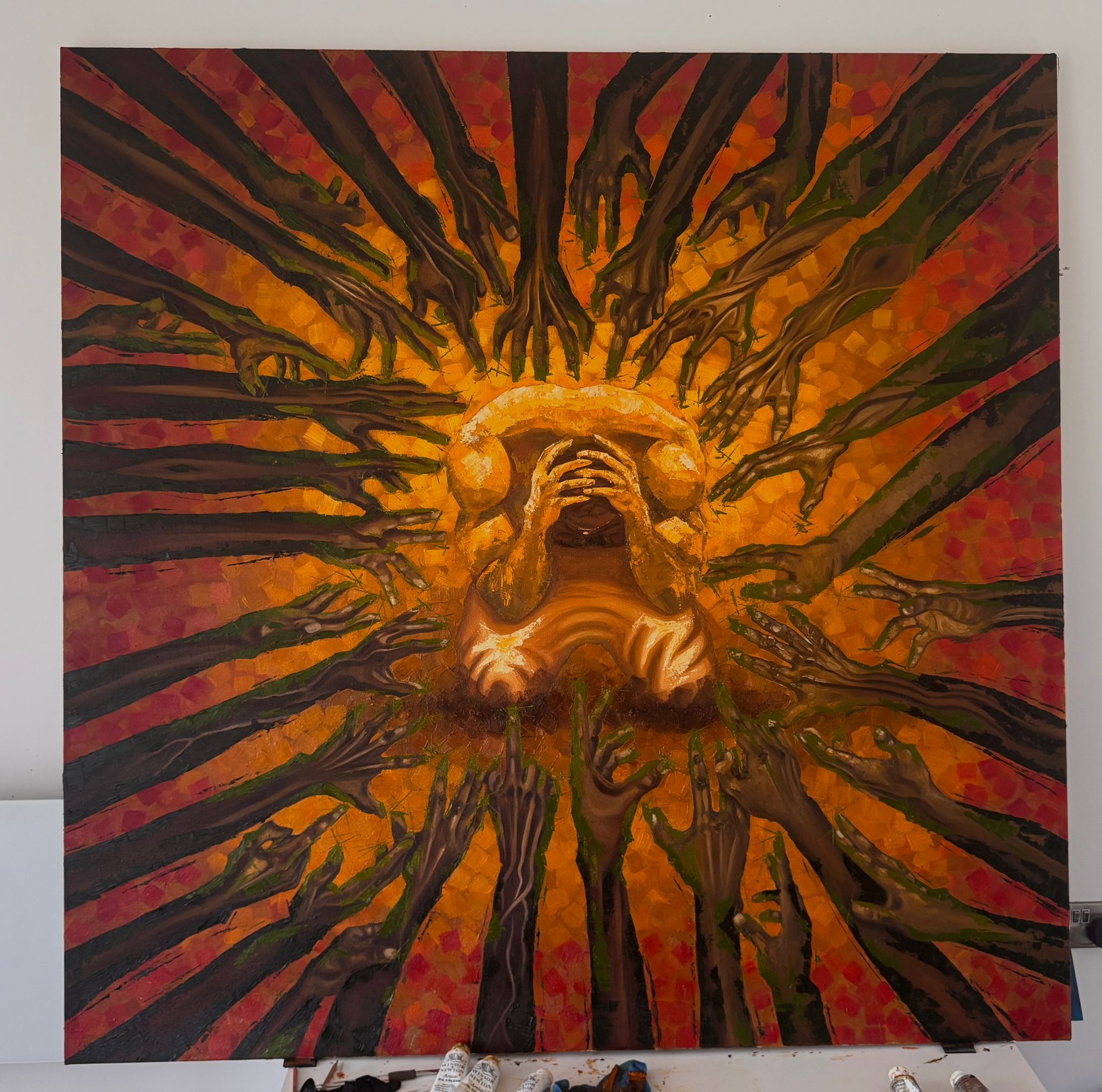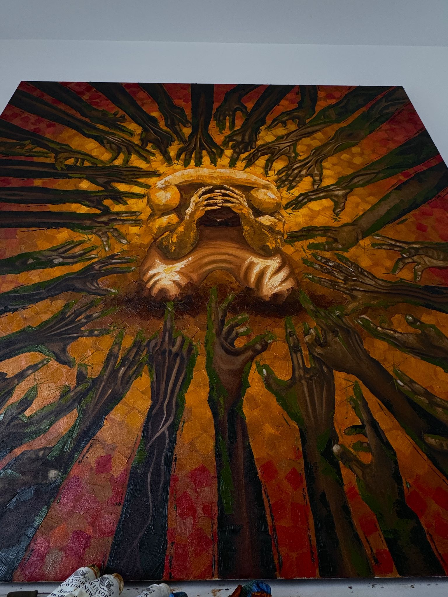 Iyaki surrounds this figure with ominous hands — dark, distorted, and reaching. These forms symbolise what he calls “the devourers”: the constant, often invisible pressures of society, relationships, and expectations that seek to drain the individual’s light. They hover just short of contact, a deliberate choice by the artist to reflect how these forces often erode us slowly through their presence, their noise, their demand for attention rather than through overt destruction.