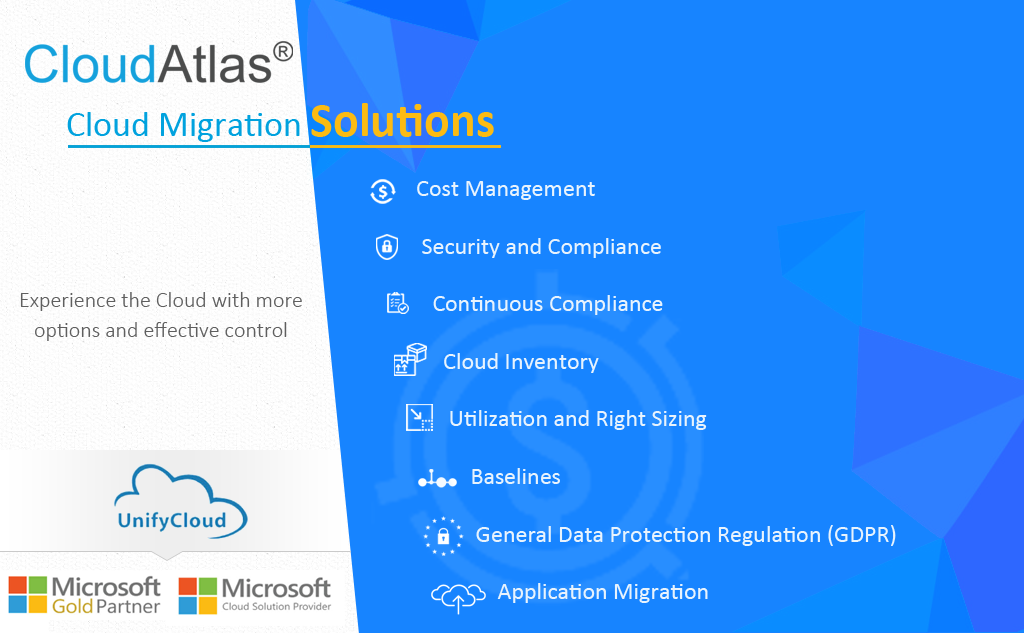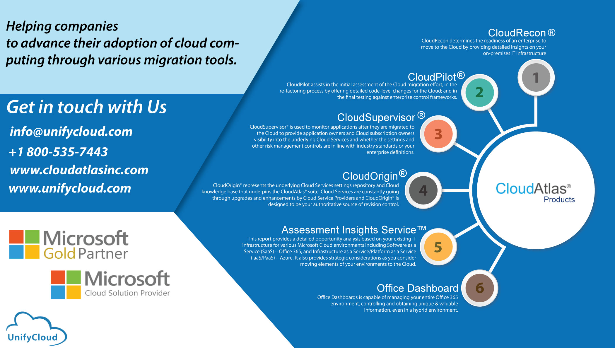 About UnifyCloud: UnifyCloud helps its partners reduce complexity and risk with CloudAtlas®. CloudAtlas® spans the entire Cloud migration journey and assesses, migrates and optimizes, monitors and provides compliance baselines for a Cloud environment. UnifyCloud is proud to be a Microsoft Gold Partner and Cloud Solution Provider. UnifyCloud was ranked #353 in Inc. 5000’s fastest-growing companies
