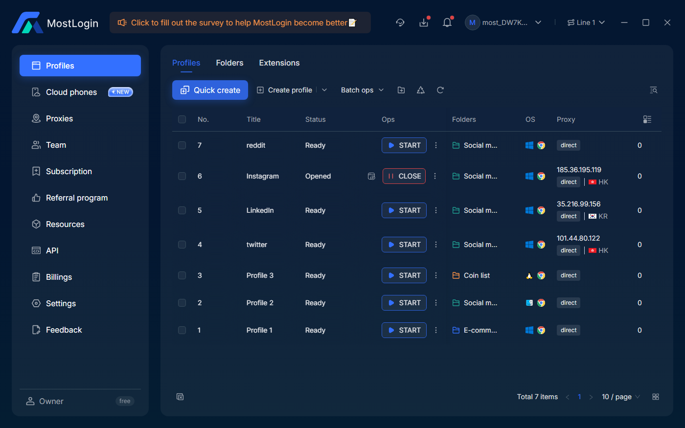 With MostLogin, multi-account management has become more efficient and secure. By using the MostLogin browser, users can manage multiple accounts across various social media and e-commerce platforms without fear of bans. MostLogin provides stable proxies and unique digital fingerprints, ensuring that each device generates a non-overlapping fingerprint so that account activities cannot be linked or flagged by platforms.