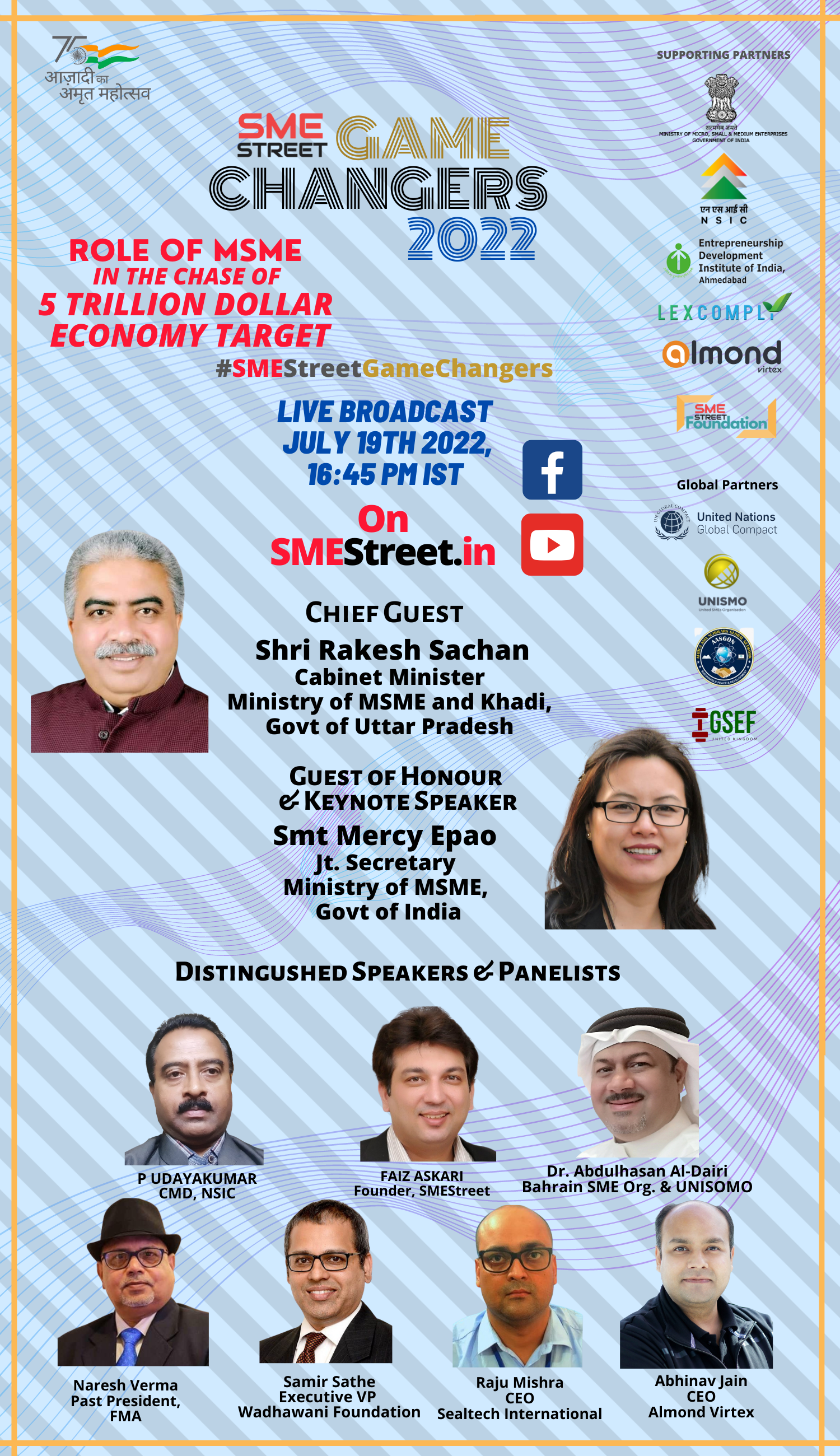 SMEStreet GameChangers Forum 2022 is supported by the Ministry of MSME, Govt. of India, Entrepreneurship Development Institute of India, Ahmedabad, National Small Industries Corporation, LexComply, Wadhwani Foundation, and Almond-Vertix. SMEStreet Foundation is the executing agency for this activity, and global partners include Bahrain-based UNISMO, AASGON, and United Nations Global Compact, UK.