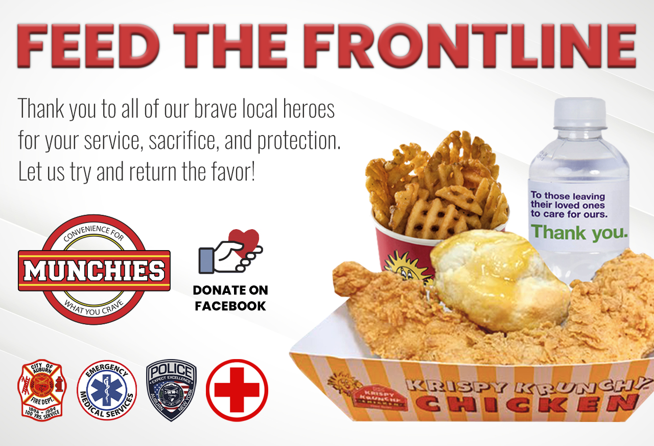 Munchies plans to continue their efforts next week with a second meal drop-off at the Auburn Community Hospital, Auburn Police Department, Auburn Ambulance Corps, Auburn Fire Company, Auburn Correctional Facility, and the NY State Trooper Headquarters in Auburn, of over 500 meals including customer donated meals and food donated by Krispy Krunchy Chicken.