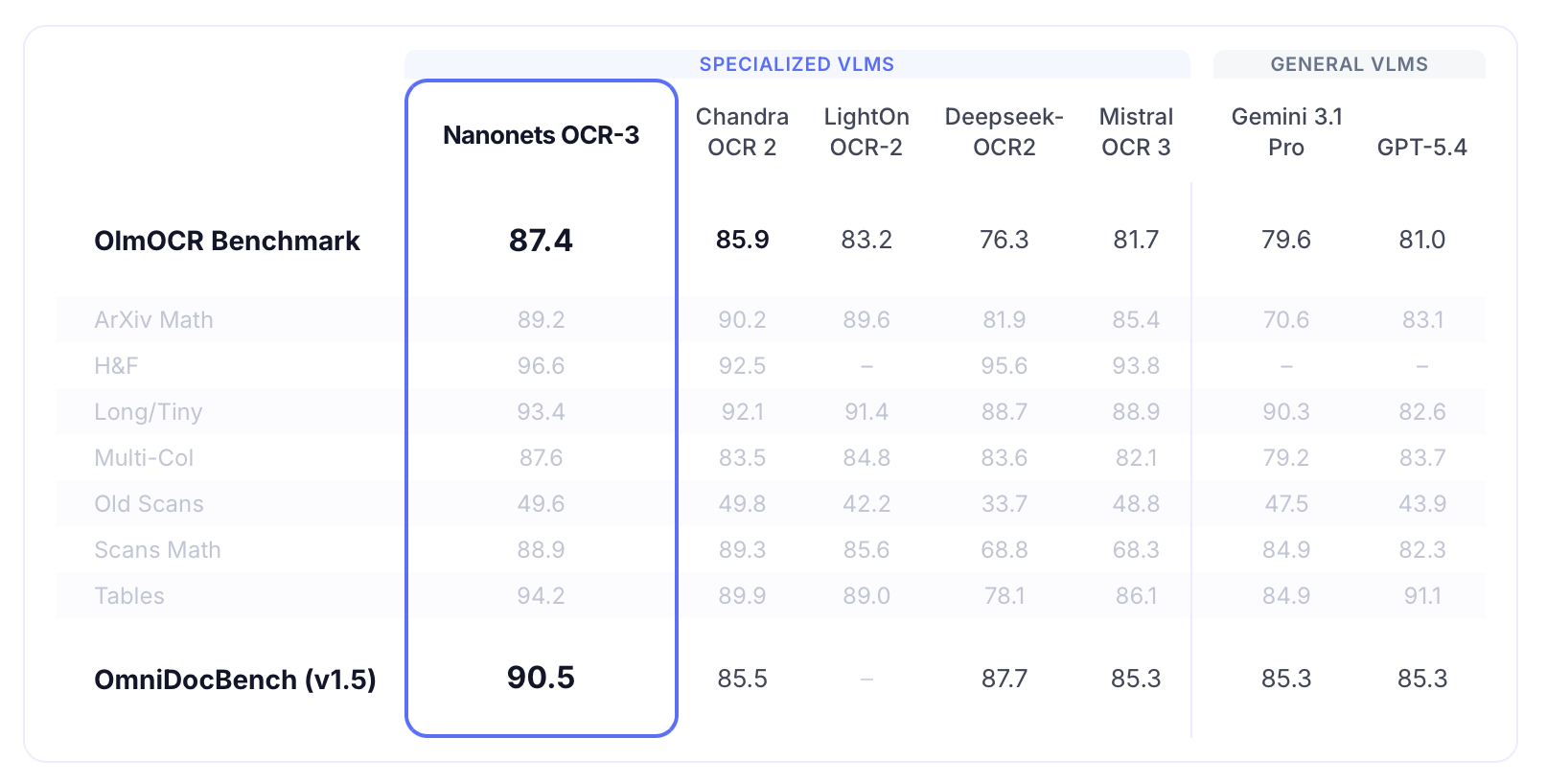 San Francisco, California Apr 9, 2026 (Issuewire.com) - Nanonets has released OCR-3, the latest model in their family of visual language models (VLMs) specialized for OCR and document understanding tasks. It is specifically built for agents, RAG, and other LLM-based use cases.