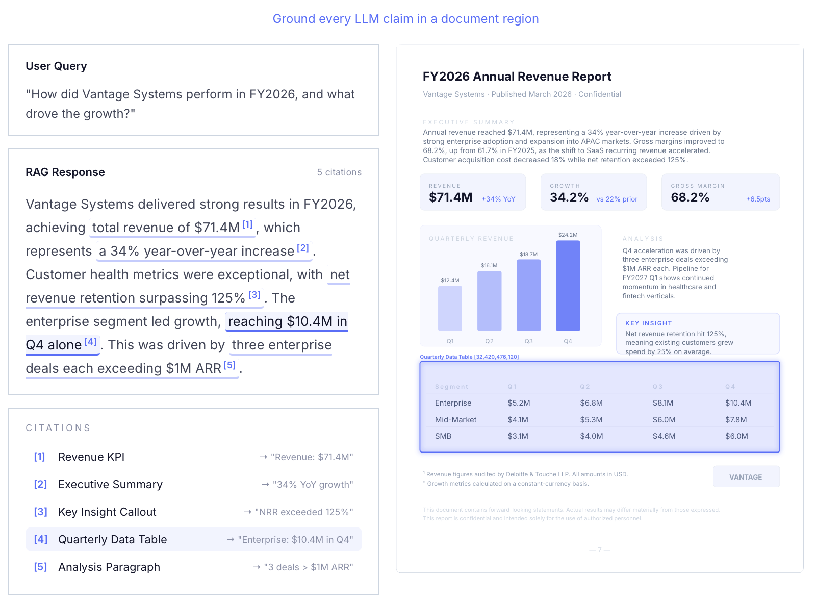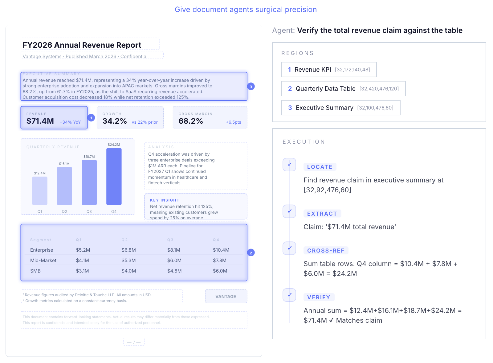 Bounding boxes: The model outputs exact spatial coordinates for every element. These are useful for RAG citations, feeding agents precise document regions, source highlighting, and observability in the agentic stack.