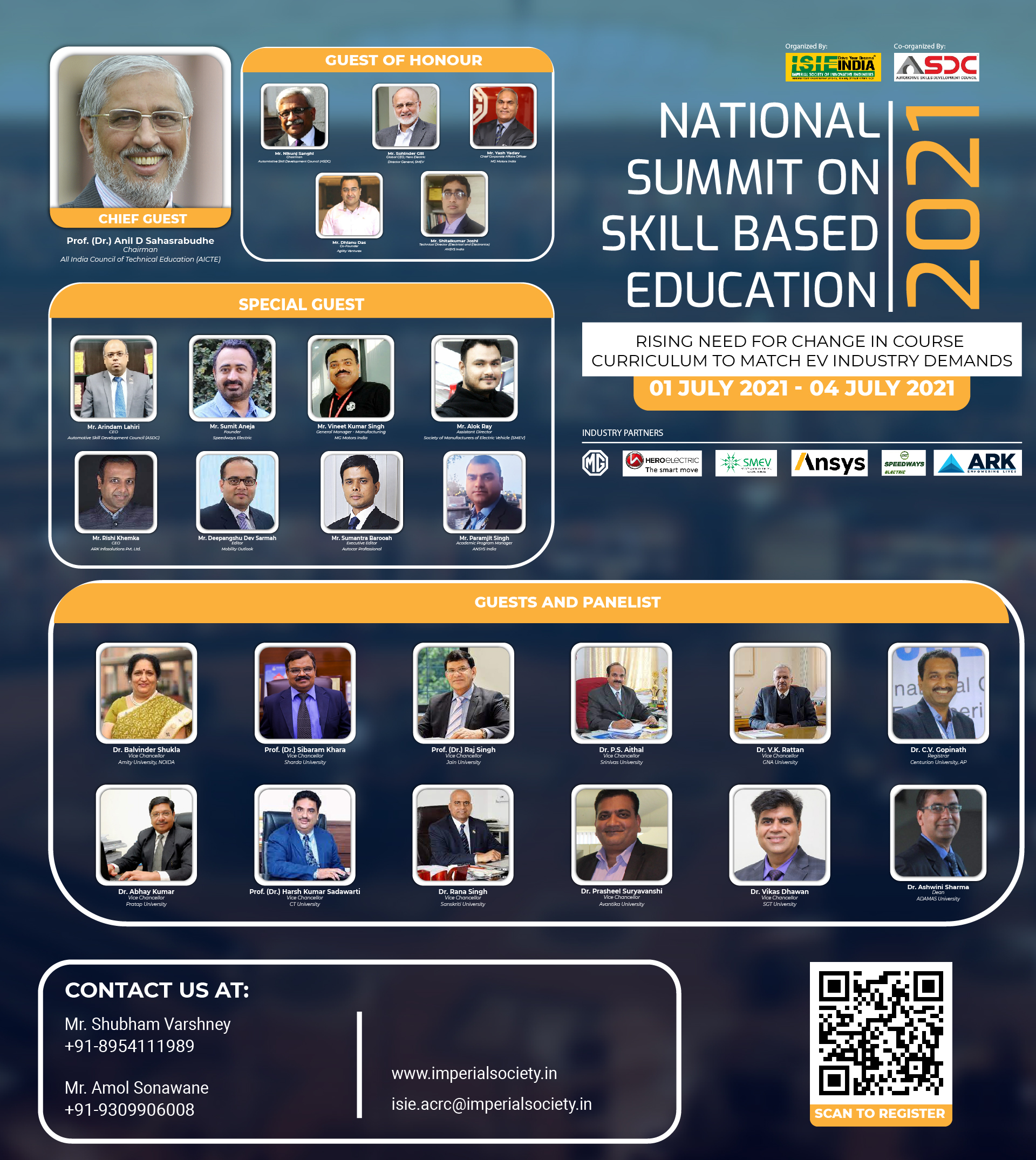 Imperial Society of Innovative Engineers (ISIE INDIA) has successfully organized the National Summit in Skill Based Education - Day 2 on “Rising need for change in course curriculum to match EV industry demand.”, Co-organized by Automotive Skill Development Council(ASDC), in association with SMEV, MG Motors India, Hero Electric, ANSYS Inc. and Speedways Electric.