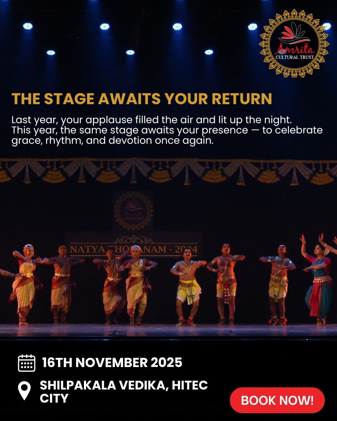 Amrita Cultural Trust is delighted to announce the 5th edition of Natya Thoranam 2025, an evening of spell-binding Indian classical dance showcasing the richness of tradition, rhythm, and grace. The event will be held on Saturday, 16 November 2025, from 4:00 PM to 8:00 PM IST, at the prestigious Shilpakala Vedika, HITEC City, Hyderabad (Telangana 500081).
