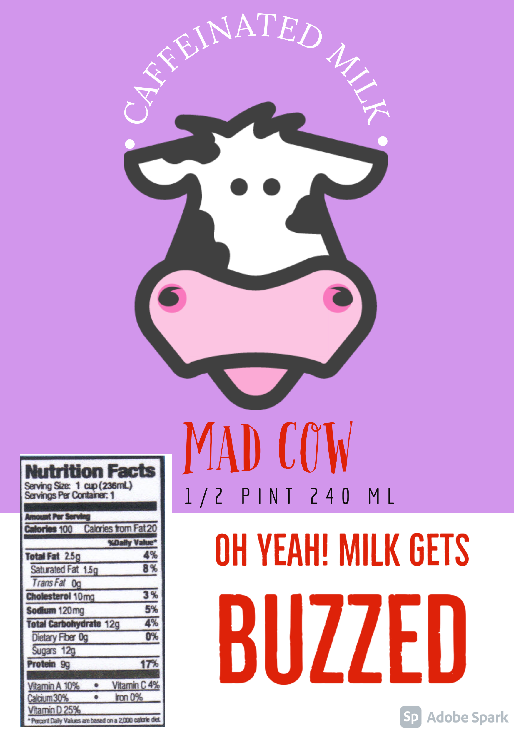 Mad Cow is a specially developed “Caffeinated Milk” to energize and refuel your body and stimulate your brain’s power of concentration. It’s not recommended for children, diabetes, and persons sensitive to caffeine. Mad Cow was born out of simple market reality. Milk sales are down, but energy drinks and specialty coffees have celebrated steady growth for more than two decades. Today, Red Bull and Starbucks make up roughly 66% of the stimulating beverage market. Meanwhile, NAUTILUS has invented “Mad Cow”, a unique One-of-a-Kind patent-pending caffeinated milk that could help recharge the dairy industry.