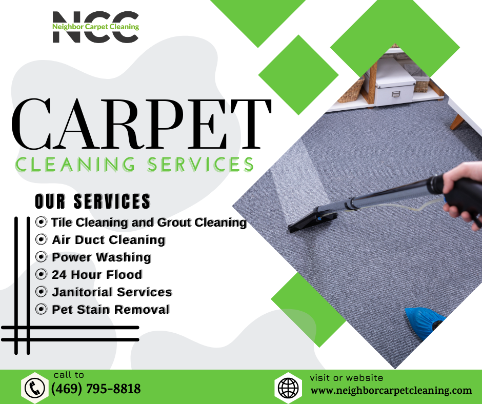 Allen, Texas Dec 21, 2024 (Issuewire.com) - Neighbor Carpet Cleaning, a leading provider of professional cleaning solutions in Texas, is revolutionizing home and business maintenance with its comprehensive range of services. Specializing in carpet cleaning, dry carpet cleaning, wood floor cleaning, steam cleaning, upholstery cleaning, tile and grout cleaning, air duct cleaning, power washing, janitorial services, and pet stain removal, the company is dedicated to delivering exceptional results that enhance the cleanliness and health of indoor environments.