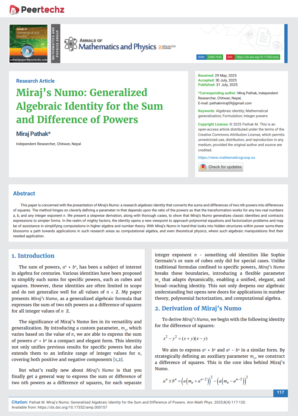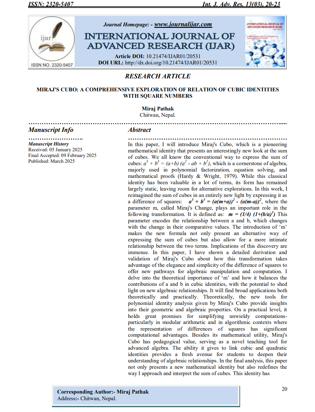 Pathak is the founder of Miraj’s Cubo and Miraj’s Numo, which are new algebraic identities representing the sum and difference of powers equated to the differences of squares through a new parameter termed Miraj’s Change. These papers are already published by international journals like International Journal of Advanced Research Miraj's Cubo - Int. J. Adv. Res. 13(03), 20-23 and Annals of Mathematics and Physics Miraj's Numo - Ann Math Phys. 2025;8(4):117-120. His papers are also listed in renowned academic library catalogs worldwide, including Harvard University Library (HOLLIS) Harvard Hollis Library - Miraj Pathak, The Royal Library of Denmark [DET KGL BIBLiOTEK] The Royal Library, Denmark - Miraj Pathak, National University of Singapore Library, University of Washington Libraries, and WorldCat.
