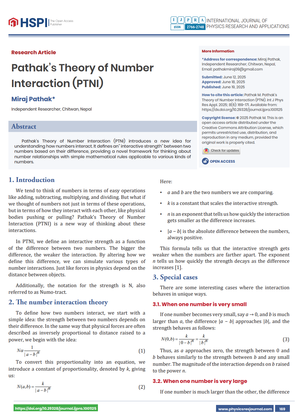 Continuing the work built on these achievements, Pathak developed the Pathak Theory of Number Interaction (PTNI) based on the idea of Interact, which encompasses the measurement of the interaction potential of numbers. It also came up with the equation for net strength, which allows for mathematical treatment of the subject. PTNI has been published and recognized internationally in various journals, including the International Journal of Physics Research and Applications Pathak's Theory of Number Interaction - Int J Phys Res Appl. 2025; 8(6): 169-171. Taking the subject and developments one step ahead, the author has come up with the hypothesis for Pathak Continuum Compression (PCCH) and is still working in this field.