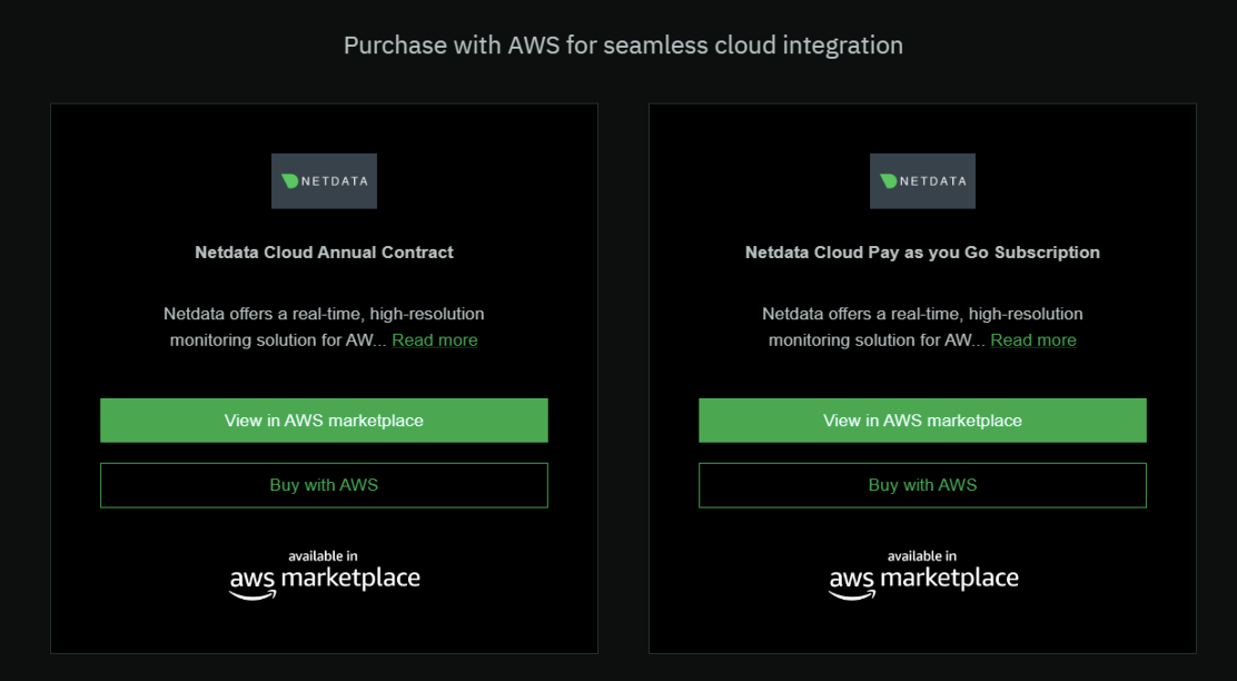 Customers visiting www.netdata.cloud can see products that are available for purchase in AWS Marketplace. Learn more about Buy with AWS by visiting the Buy with AWS webpage.