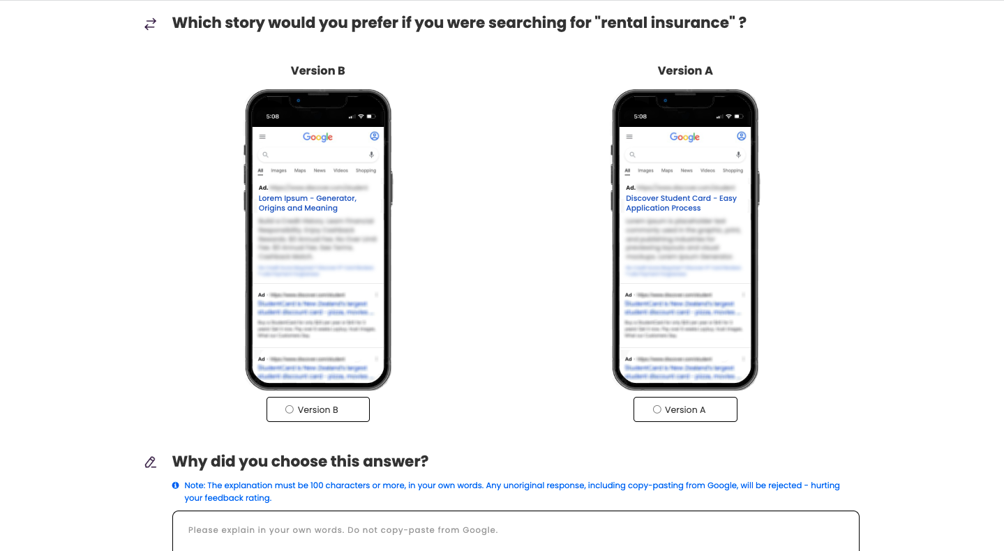 The second prong deals with the efficacy of the keyword-based headline suggestions. Poll the People also offers user testing software that produces both qualitative and quantitative feedback on the Google headline options. This serves as a precursor to any live A/B testing with Google by allowing users to improve headlines before launching a campaign. It also eliminates any need to have the significant existing volume on Google to produce statistically significant results.