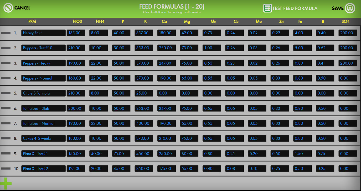 FCS2 has the capacity to record and manage up to 150 different recipes, each with its own PPM-based nutrient levels. Ensure that the optimum feed is being delivered to your crop at each stage of its development to maximize your yields.