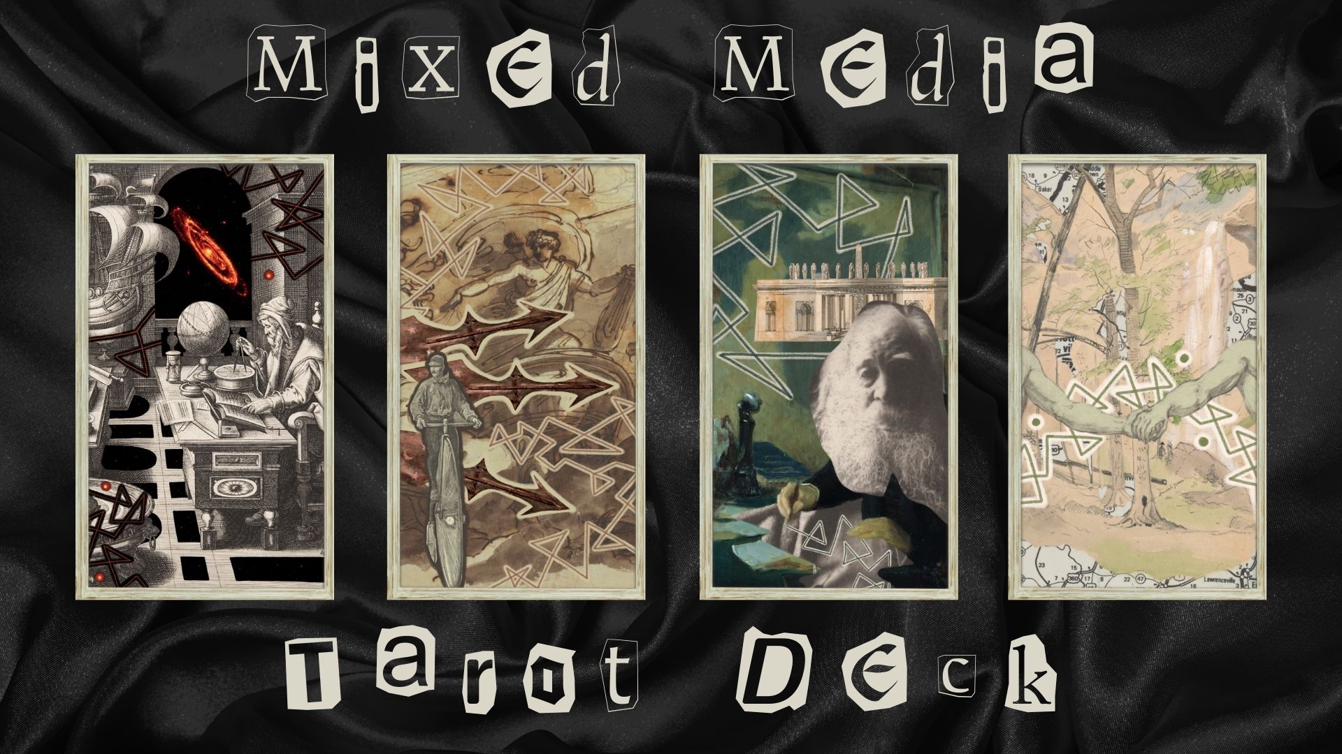 The final difference is that most decks are very visually similar. The colors and the drawing style are usually the same and often composed of simple, elegant line work and complete with beautiful foiling. Mixed Media Tarot cards, however, are a collage of any and everything that fits with the card's narrative. Mallery says the images are mostly taken from Nasa and Smithsonian's open access ( CC0 ) collections, though some personal artwork was also placed strategically in a few of the cards.