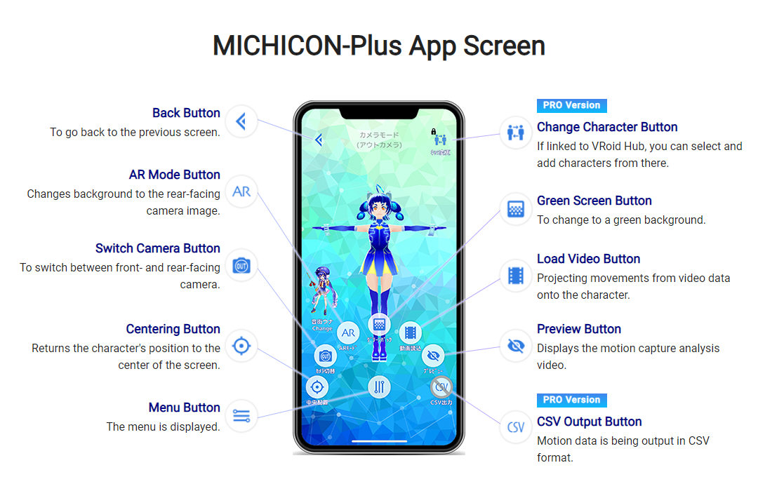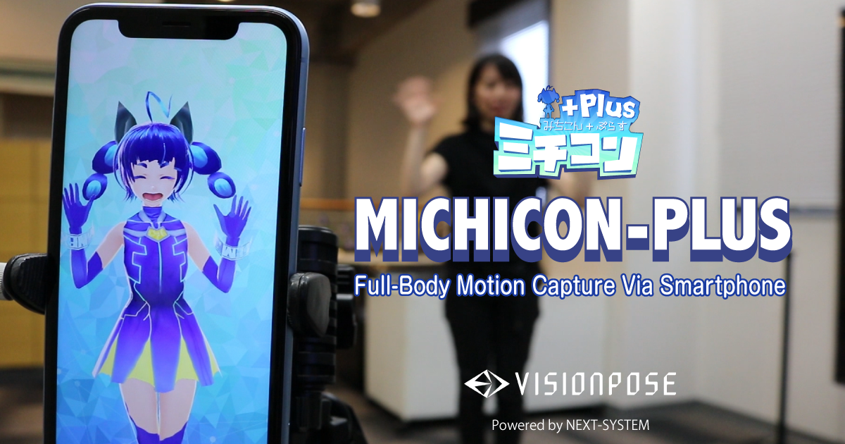 “MICHICON-Plus” is a motion capture application that uses the latest technology to capture movements of the whole body of a person with the help of AI pose estimation engine “VisionPose”, and projects these movements on a 3DCG character.