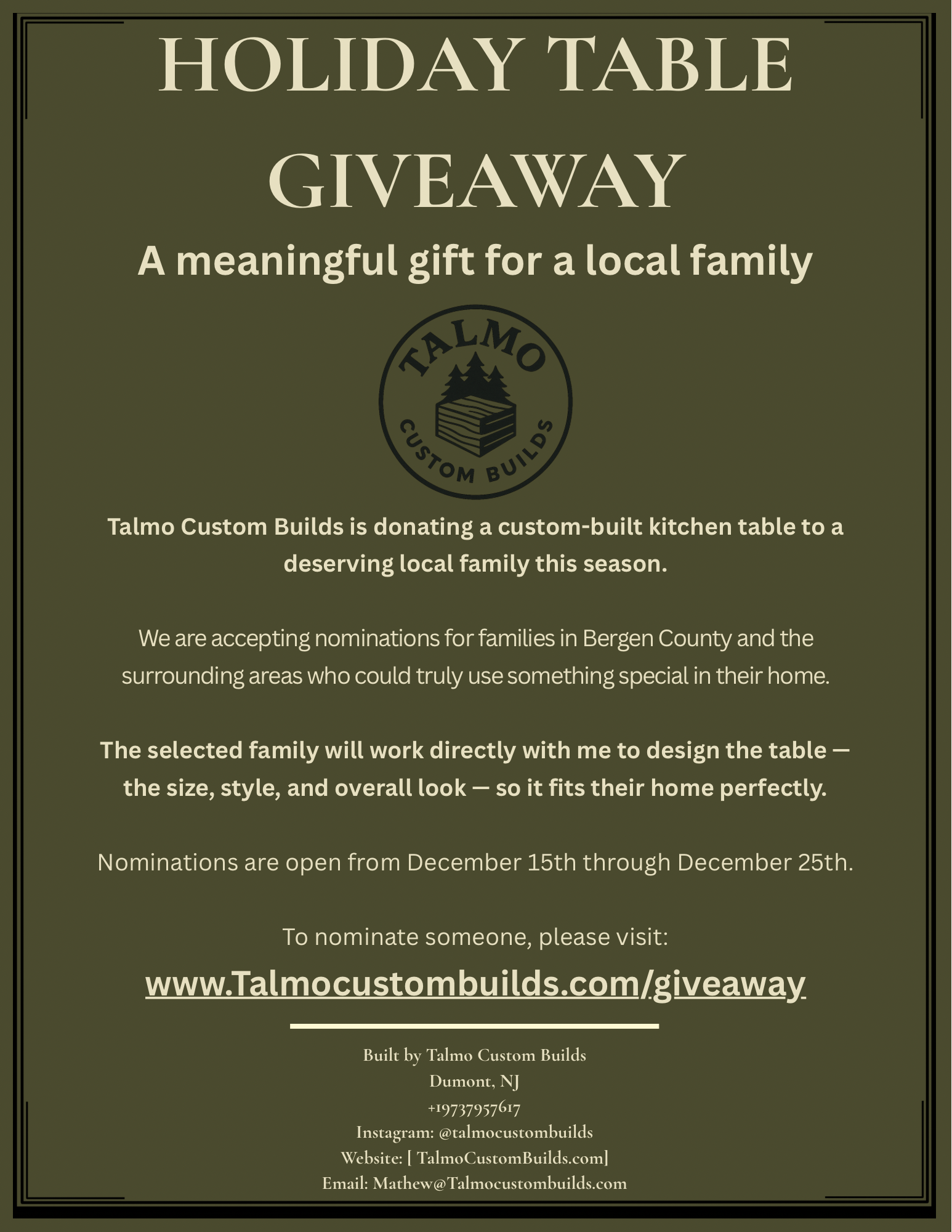 Dumont, New Jersey Dec 15, 2025 (Issuewire.com) - Talmo Custom Builds, a North Jersey-based woodworking business, has launched a special community initiative this holiday season: a Free Custom Kitchen Table Giveaway for one local family. The project aims to bring something meaningful into a home that could truly benefit from it. From December 15th through December 25th, residents of North Jersey can nominate a family they feel deserves this unique opportunity. The winning family will collaborate directly with craftsman Mathew Talmo, the owner of Talmo Custom Builds, to design a fully custom kitchen table. They will select the size, style, and overall aesthetic, and the finished piece will be handcrafted specifically for their home.