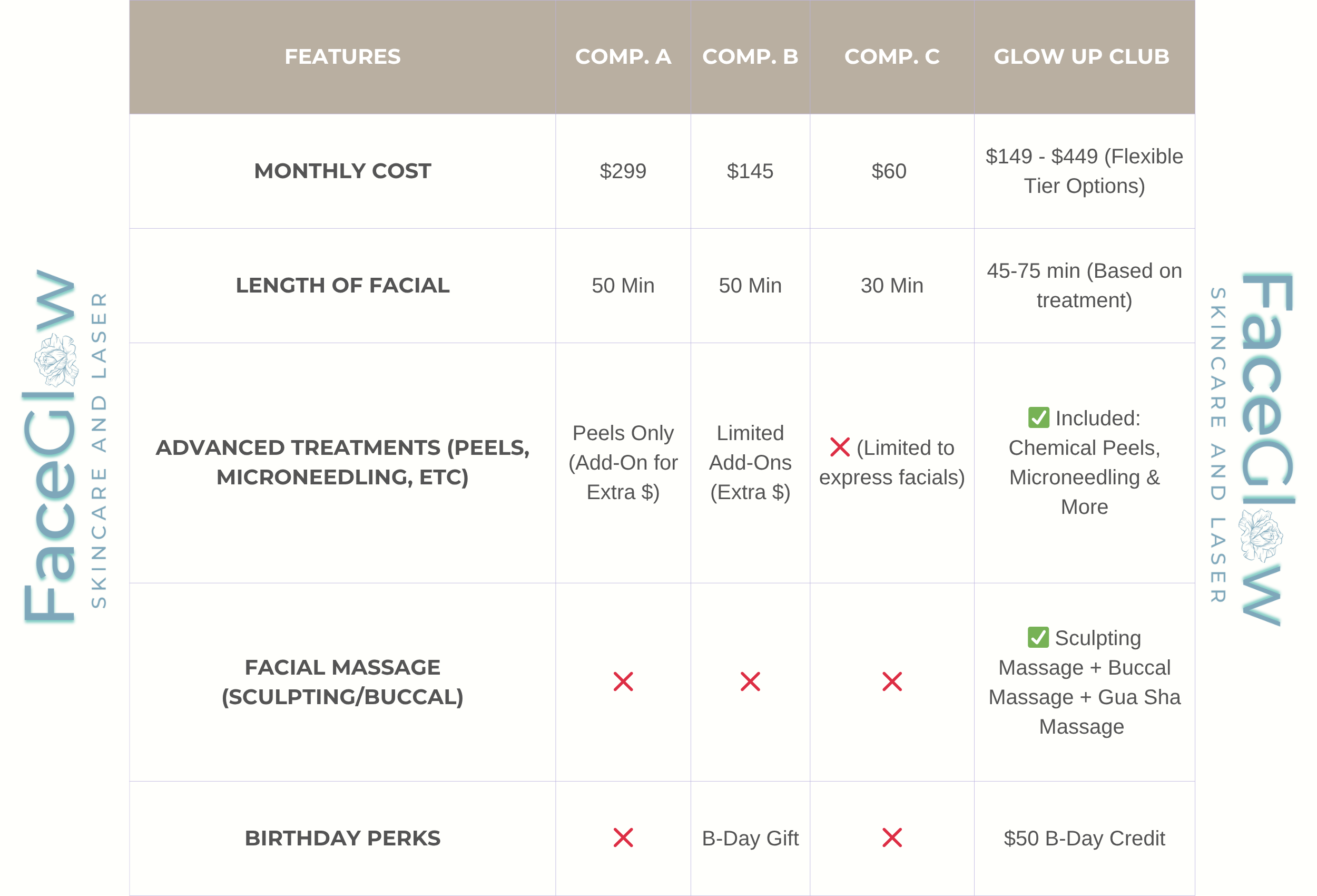 - Glow Starter – $149/month: 1 treatment per month