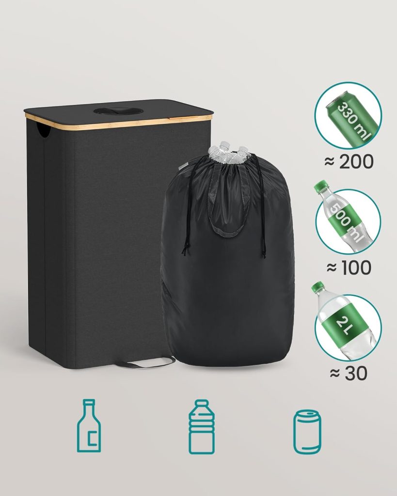 The SONGMICS RRB509 container offered by olmio.pl features a 95-liter capacity accommodating approximately 200 cans, a self-sealing drop-in opening that prevents odors from escaping, an interior bag with a drawstring for easy transport to return points, and lockable wheels for stability. The product assembles in under five minutes without tools and folds flat for storage when not in use. The interior bag is machine washable. Both the black (Ink Black) and gray (Light Gray) color variants are priced at 99.99 PLN and are available for next-day dispatch from a warehouse located in Poland.