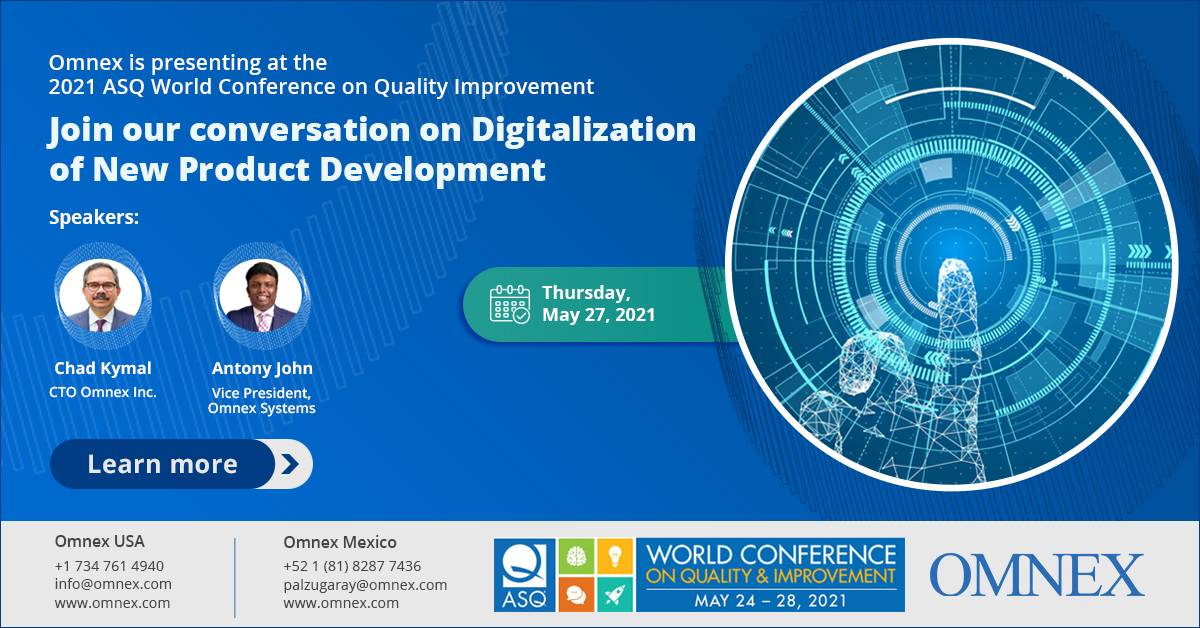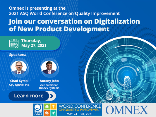 Omnex is pleased to announce that we are presenting at the 2021 ASQ World Conference on Quality Improvement on the topic "Digitalization of New Product Development".