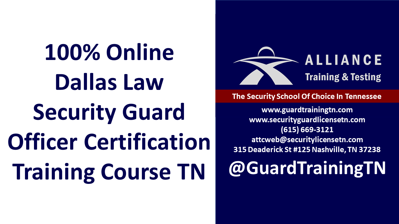 Between modern innovation and practical approaches, Alliance Training & Testing has become Tennessee's most reputable and trusted veteran-led security guard license training. Alliance Training and Testing has been deemed as the top professional certification for security practitioners and has become the gateway for a successful Dallas Law complince execution in 2023. To learn more about Alliance Training & Testing 100% Online Dallas Law Course details, you can do so by reviewing the overview video by clicking here.
