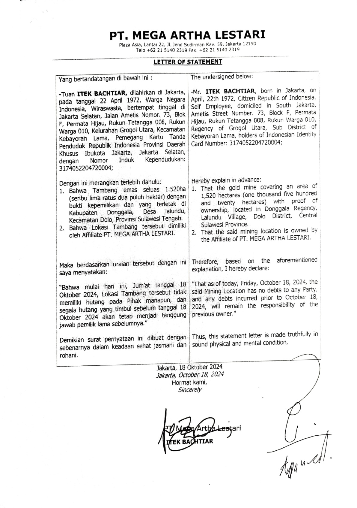 Sulawesi Selatan, Indonesia Oct 27, 2024 (Issuewire.com) - OV9 Infinity Limited (OV9), a leading commodities trading company based in Hong Kong and operating across Southeast Asia, is pleased to announce the acquisition of a 15% stake in a gold mine located in Lalundu Village, Dolo District, Donggala Regency, Central Sulawesi Province, Indonesia. The acquisition was made through partnerships with PT Mega Artha Lestari and PT Resources Energi Indonesia, marking a significant expansion of OV9’s presence in the region's essential commodities sector.