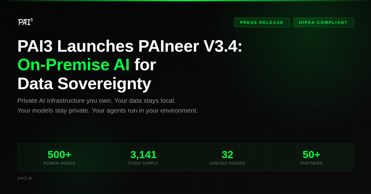 PAI3 Network is a decentralized personal AI infrastructure platform that enables professionals and enterprises to deploy AI agents, manage encrypted data cabinets, and connect to external systems — all on hardware they own. PAI3’s NFT-anchored ownership model ensures that users maintain full sovereignty over their data, credentials, and AI workflows. The platform is HIPAA-compliant by architecture, with over 500 Power Nodes deployed across healthcare, legal, and enterprise teams.