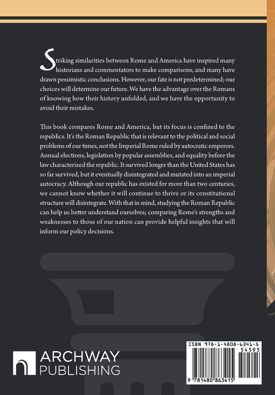 The book describes and chronicles these two perennial republics, explaining how they formed, developed, and prospered. It also examines a variety of subjects common to both nations, including slavery, military victories, political partisanship, wealth, and class conflicts. The book then analyzes whether the American government will disintegrate just as the Roman Republic did or whether it will transition into another form of government similar to Rome’s imperial dictatorship.