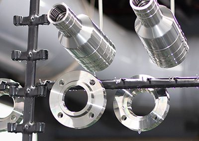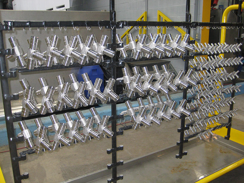 Peregrine Metal Finishing Ltd. is an electroplating service company that has designed a flexible production process utilising a linear design and tank layout. They incorporate Zinc Nickel plating, an ambient black oxide as well as passivation treatment of stainless-steel components into one production line that allows them to process different products at the same time using one operator with various rack configurations. The most common products they process are industrial fittings and adapters that range in sizes and dimensions from 8 oz. up to 100lbs. Their unique plating line allows for the processing of Zinc Nickel, passivation, and black oxide all at the same time, increasing their production speeds.