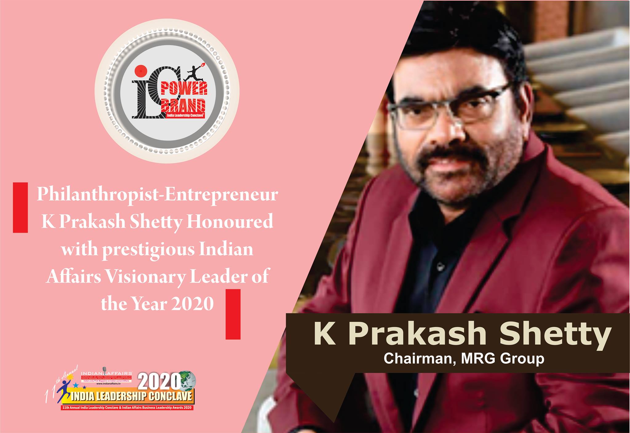 Mumbai, Maharashtra Jan 26, 2021 (Issuewire.com) - MRG Group Chairman K Prakash Shetty bagged the prestigious Indian Affairs Visionary Leader of the Year 2020 at the 11th Annual India Leadership Conclave & Indian Affairs Power Brand Awards held recently on the 26th of December 2020 under the theme Rebuilding India: Opportunities in the pandemic. The event witnessed top global voices deliberating on crucial issues following the impact of the Cocid-19 pandemic. Korangrapady Prakash Shetty of Marg Group was in a nation-wide voting process of six finalists conducted by Network 7 Research. The public mandate & Jury selected K. Prakash Shetty for the coveted title. India Leadership Conclave & Indian Affairs Business Leadership Awards organized by Network7 Media Group's Indian Affairs is Asia's most eagerly awaited leadership event where the platform has established a credible platform of serious discussion where Brand India's most illustrious Leaders & icons assemble to discuss the roadmap for India's growth trajectory.