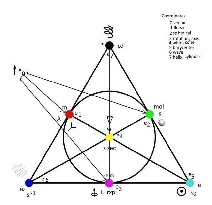 Unit 8: the 6-roll mill (figure 4) has a potential described by an elliptic umbilic of catastrophe theory. The high-speed flow inside deuterons AK can be a quark/gluon plasma, containing also other particles at suitable times. In octonians, flows have along a world line a normal vector for its equipotentials and a tangent vector for its streamlines. They can come higher dimensional along with a flow as surface, not a curve, also 3-dimensional. A good coordinate description of flows is 7-dimensional, of atoms 6-dimensional, for fields 5-dimensional. There are many projective dual 3- and 4-dimensional spaces from which space and spacetime are only one example in octonians. The Fano memo (figure 5) shows the coordinates as seven points of a minimal projective plane and the seven lines are 3-dimensional subspaces. The points not (collinear) on a fixed-line can present the dual 4-dimensional affine space. In the Fano memo, the coordinate e0 is drawn outside at left since it sets vectors. The EMI point 7 at the tip of the Fano triangle is a rolled circular coordinate for light and exponential functions describing it.