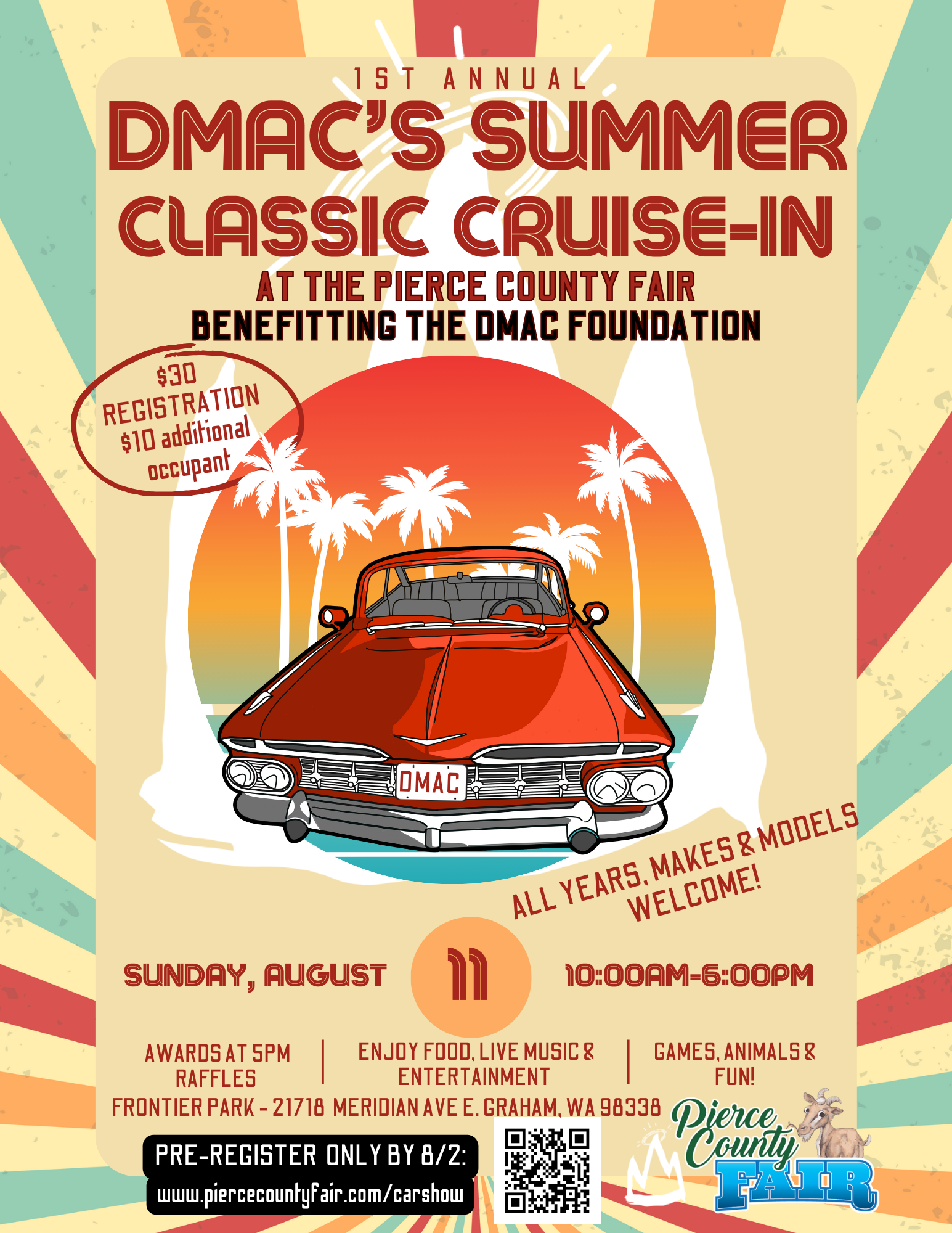 The Pierce County Fair is excited to announce a special fundraising car show benefiting the DMAC Foundation, DMAC’s Summer Classic Cruise-In. The event will take place on Sunday, August 11th, 2024, from 10:00 AM to 6:00 PM at Frontier Park in Graham. A portion of the proceeds from this event will go to support the DMAC Foundation, helping to further its mission.