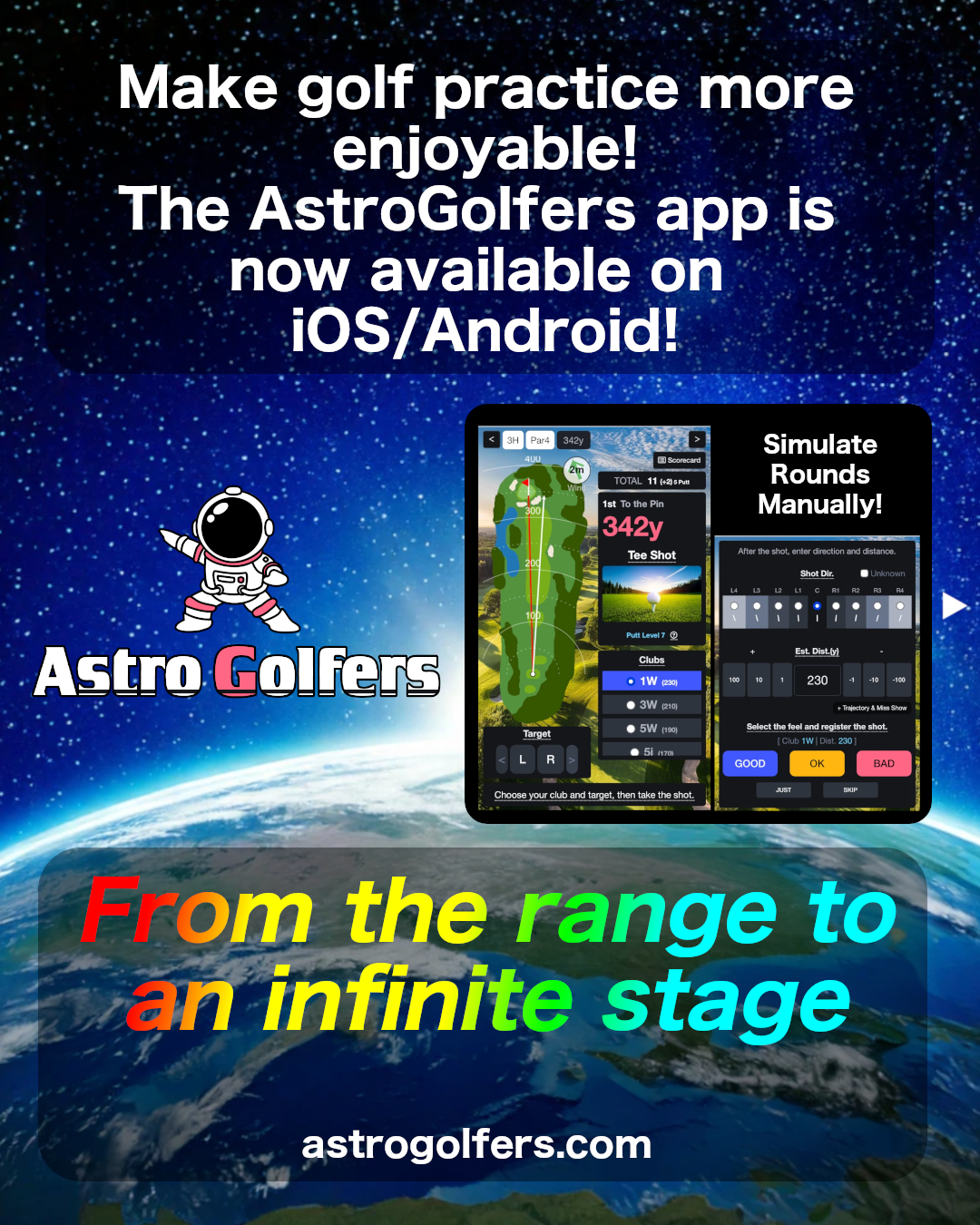 “Astro Golfers” is a completely new type of app that lets users enjoy a realistic round experience through simple input—without any measuring devices—whether at a driving range or at home.