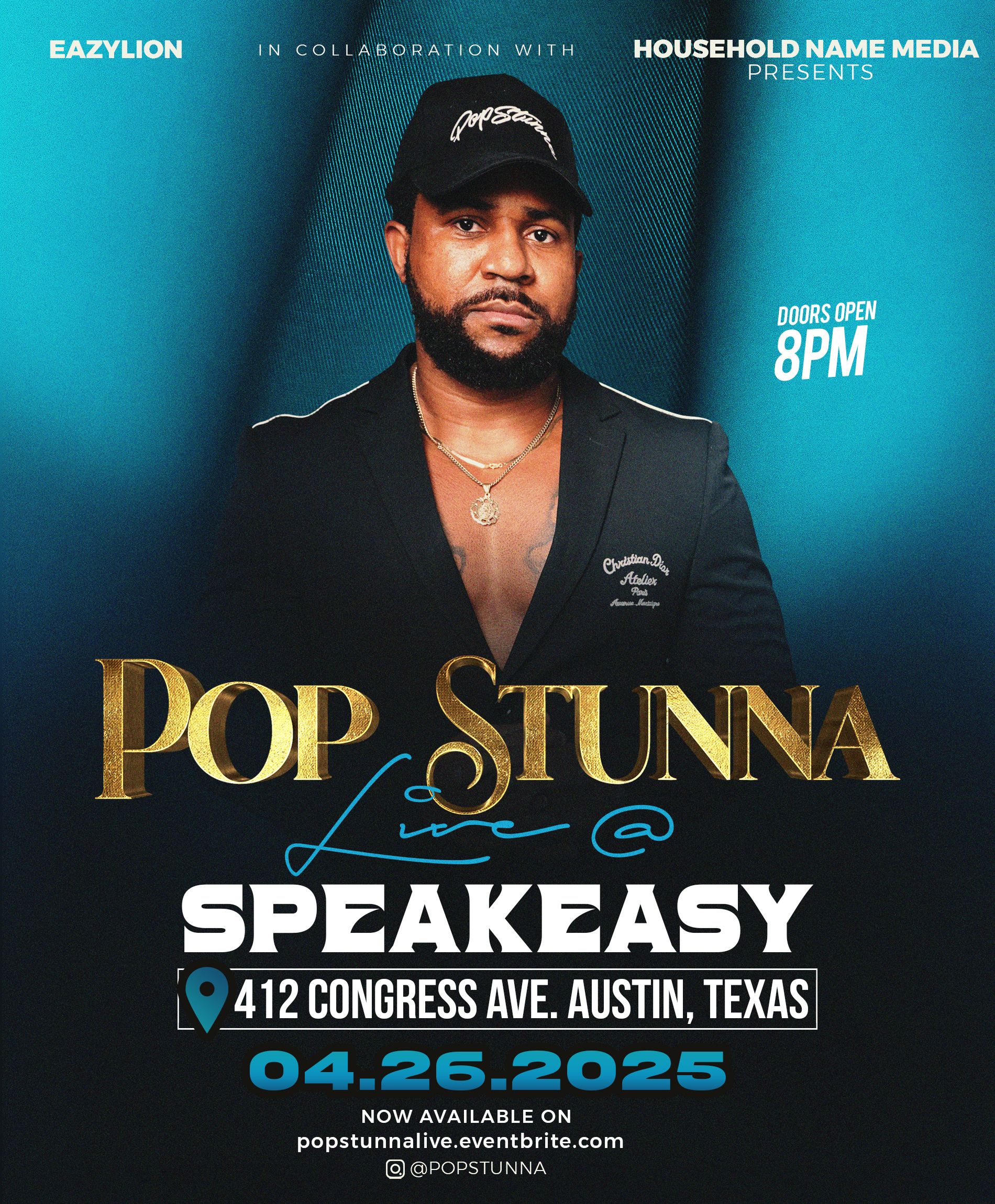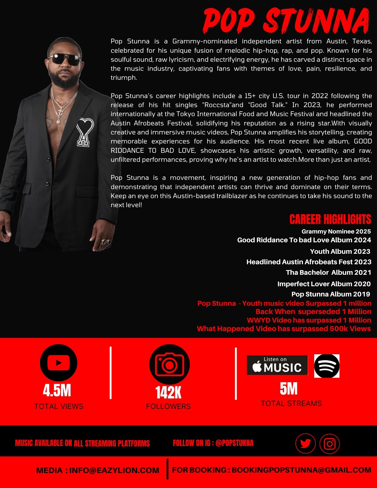 Pop Stunna, a rising Austin-based artist, is known for his dynamic rap style, captivating melodies, and signature beats, as well as his calm demeanor, perseverance, and authenticity. Originally from Nigeria, his musical journey began at a young age. Despite challenges, he has remained dedicated to his craft, turning his dream into reality. On April 26th, 2025, Pop Stunna will headline his first-ever live show at Speakeasy in Austin, Texas. Backed by his band, this highly anticipated event will showcase his electrifying stage presence and unique sound. Listen to his acclaimed music on Spotify and YouTube. For more updates, email: info@eazylion.com .