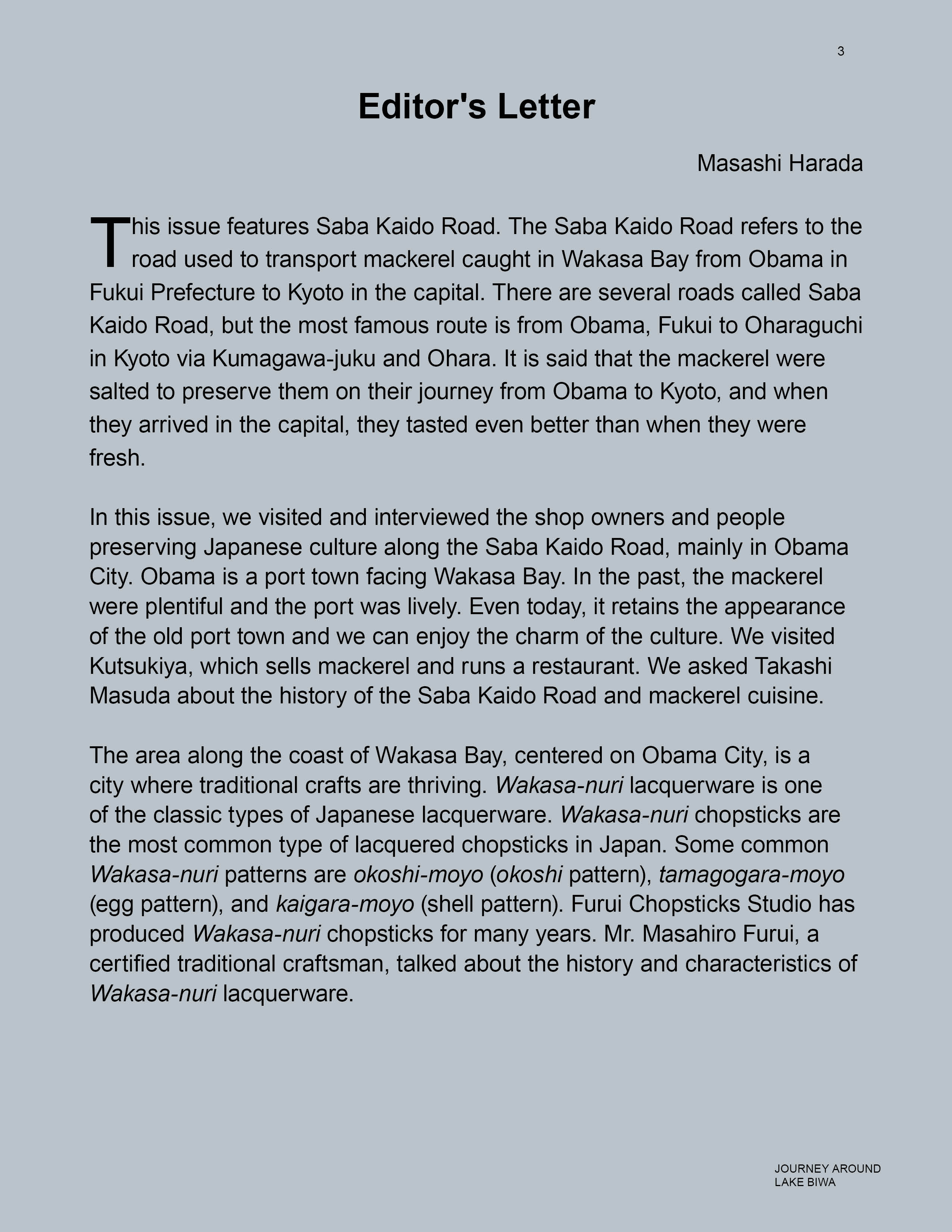 Osaka, Japan Sep 22, 2019 (Issuewire.com) - The Zipangu Bridge has published “Saba Kaido Road, Obama, & Kyoto,” the eighth issue of the travel, culture and history magazine, “Journey Around Lake Biwa.”