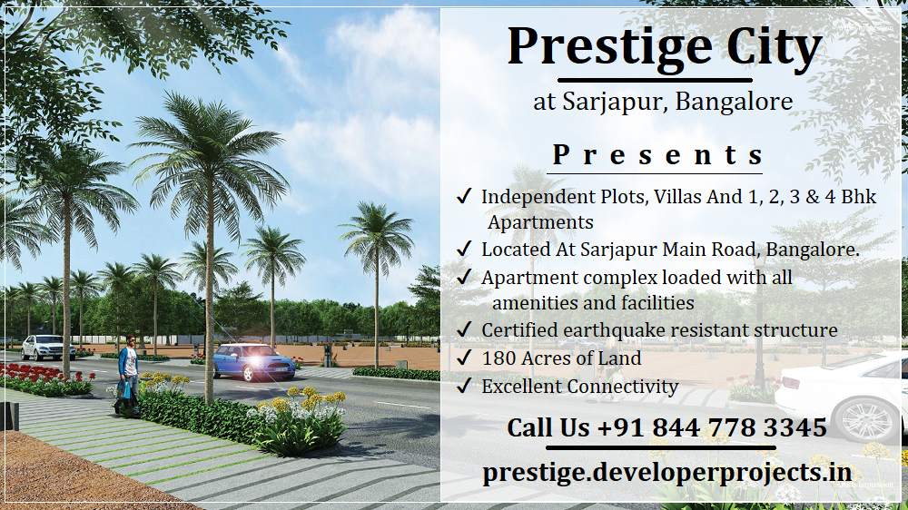 Bengaluru, Karnataka Aug 16, 2021 (Issuewire.com) - Prestige City is a futuristically developed residential project by Prestige Group, which is situated in Sarjapur Road, Bangalore. This huge development Spread across over 180 acres with multiple housing blocks. The project is offering 1, 2, 3, and 4 BHK Plots, Apartments & Luxurious Villas.