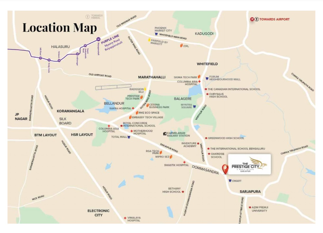 Prestige Great Acres Bangalore’s location on Sarjapur Road puts it right in the center of everything. Work hubs, schools, quality health care facilities, malls, and hotels are all within close reach. It has excellent connectivity to Hosur Road, Whitefield, Koramangala, and HSR Layout. The proposed Peripheral Ring Road (PRR) and Satellite Town Ring Road (STRR) are in close proximity and will further increase connectivity.